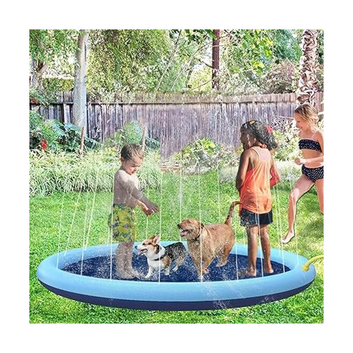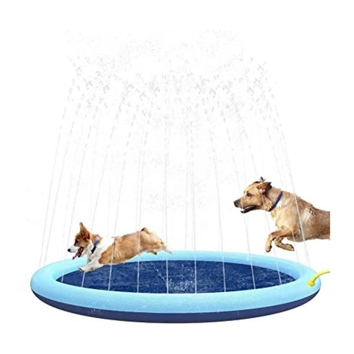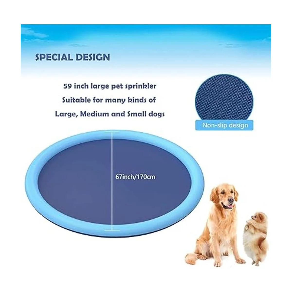 Diseño antideslizante: la piscina de aspersores para mascotas tiene un gran diámetro de 59 pulgadas y el centro adopta un diseño antideslizante grueso, que es lo suficientemente grande como para alojar a niños y mascotas niños amigos jugar de forma segura en el interior, así que deja que las piscinas de mascotas y niños hagan que este verano sea más divertido