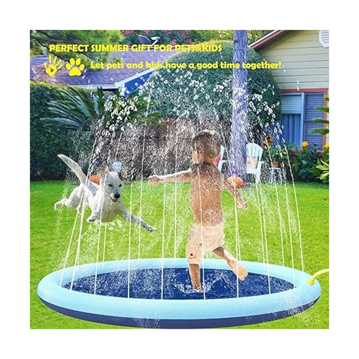 Fiesta en el agua : estas piscinas para mascotas y niños pueden hacer que tus amigos peludos no solo se sientan frescos, sino que también reducen el miedo al agua cuando juegan, deja que las mascotas y los niños pasen un buen rato juntos. Por lo tanto, la almohadilla para aspersión de mascotas es el mejor regalo en este caluroso verano para mascotas.