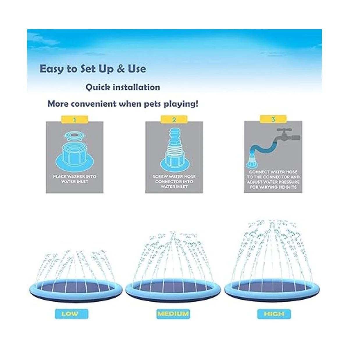 Una sola vez Simplemente conecta la almohadilla del rociador a una manguera de jardín o tubo de PVC, simplemente ajusta la presión del agua para bajar o aumentar la altura de pulverización. Adecuado para jardines, playas, parques, etc. Más conveniente cuando juegas