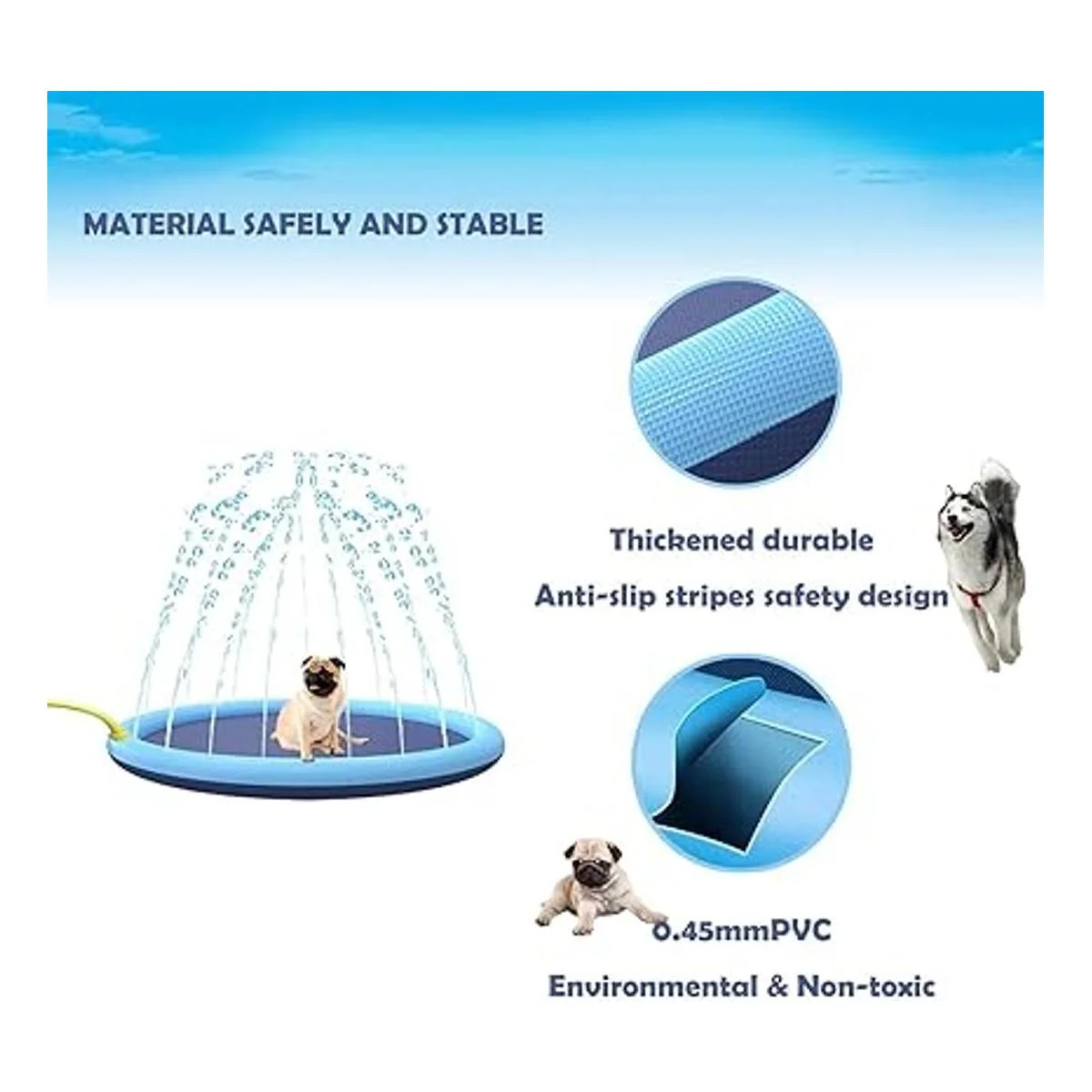 Material ecológico: la alfombrilla de juego para mascotas está hecha de material de PVC de 0.018 in de grosor y duradero, ecológico y no tóxico sin BPA ni ftalatos. Mantén a las mascotas a los niños frescos y seguros con juguetes de agua al aire libre para nuestras mascotas y niños.
