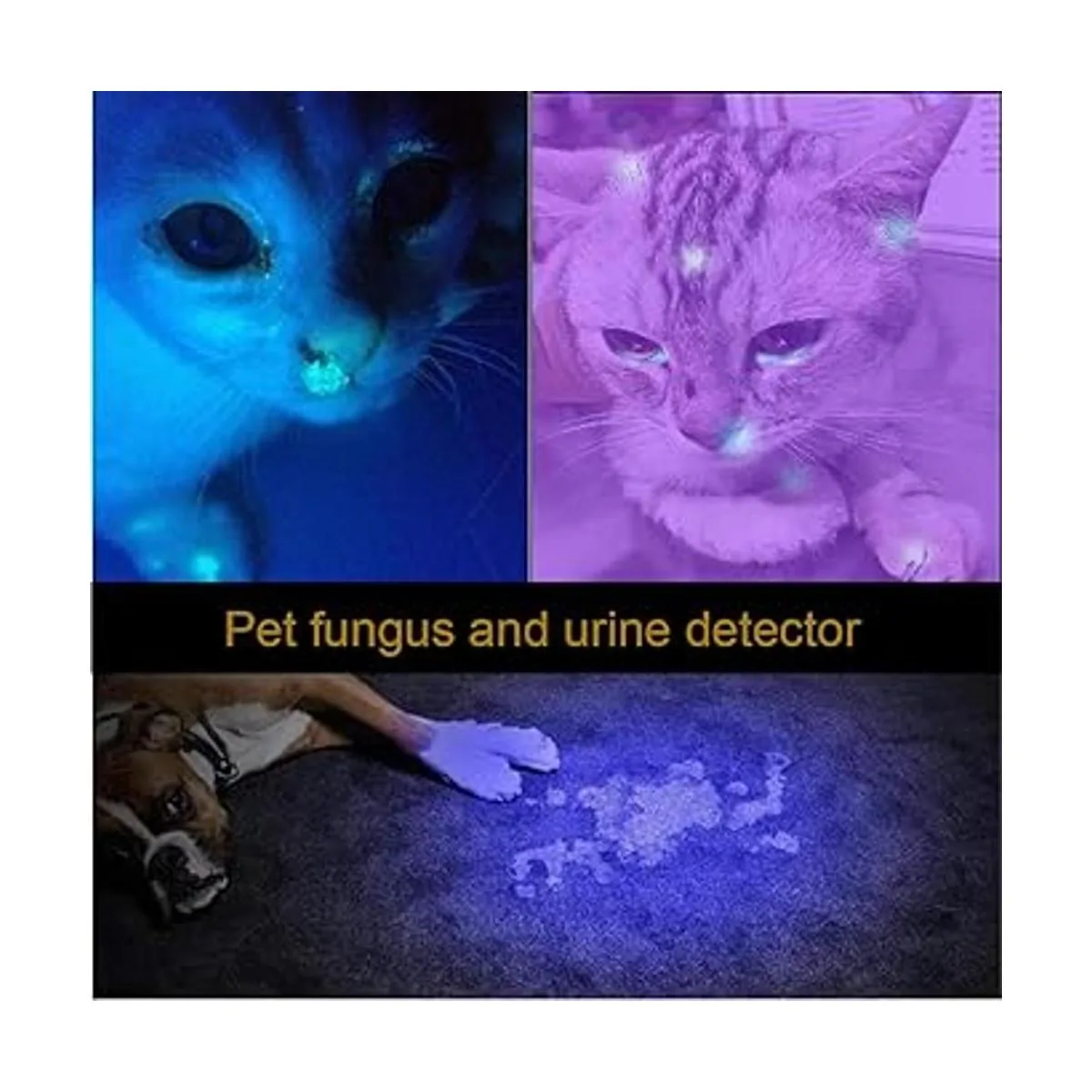 Aplicaciones multifuncionales potentes. Los rayos UV pueden revelar las manchas o fluidos que son invisibles para los ojos desnudos en el suelo o incluso la hierba. como detectar documentos falsificados, verificación de dinero, detección de ámbar y joyas, detección de orina de mascotas y manchas