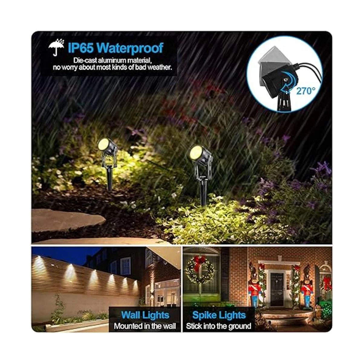 Resistente al agua IP65 y duradero: el diseño impermeable IP65 mejora en gran medida la estabilidad de la iluminación exterior y el uso a largo plazo 5000 H. Cuerpo de aluminio fundido grueso y diseño de cubierta de lente de vidrio que soporta todo tipo de mal tiempo. Con cabezal de inclinación ajustable de 270 para que puedas apuntarlos en cualquier dirección, perfecto para paredes, árboles, arbustos, maleteros, banderas y vallas; ampliamente utilizado para jardín, patio, entrada y decoración al aire libre.