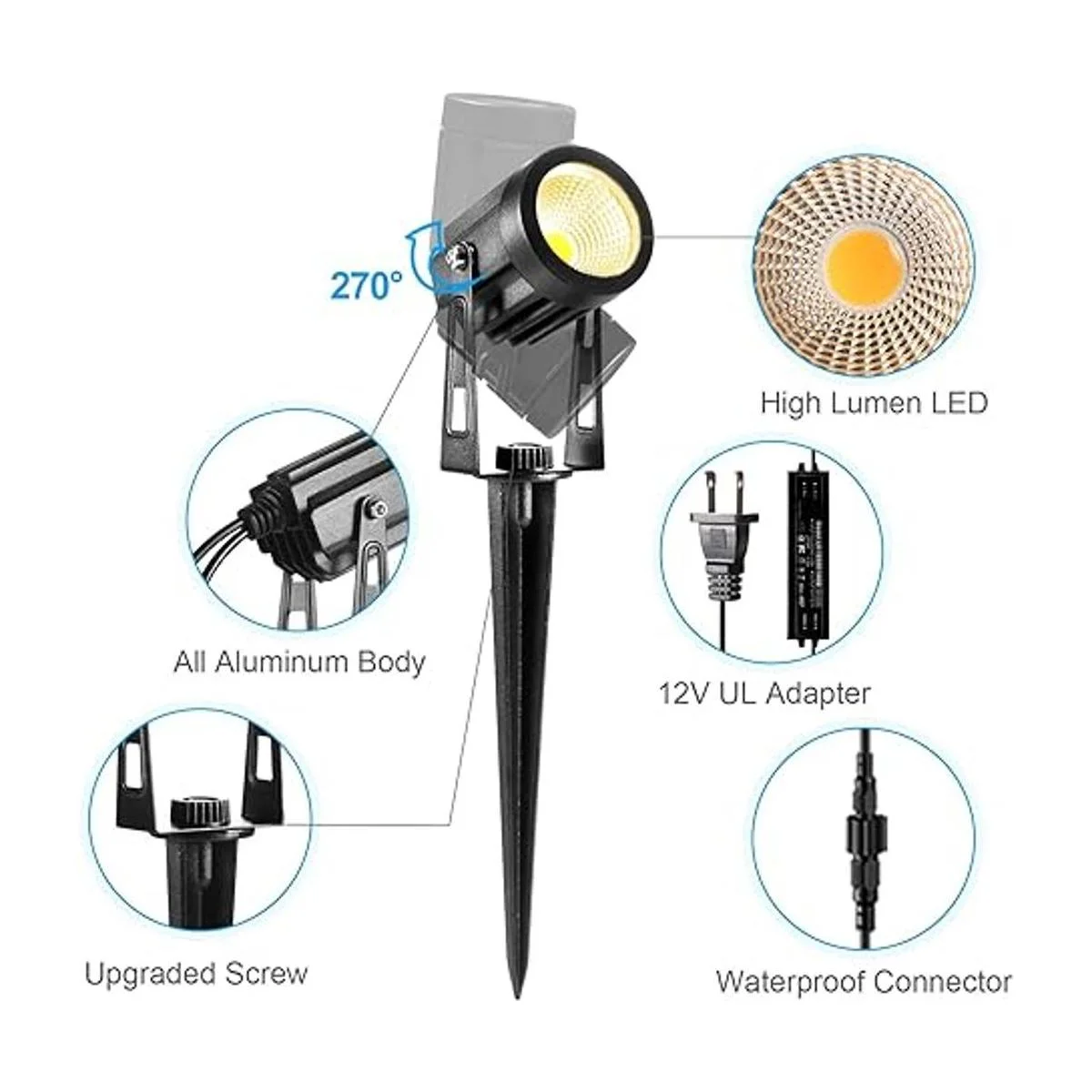 Focos seguros para exteriores: voltaje de trabajo seguro de 12 V, adaptador con certificación ETL incluido, sin riesgo de sobrecalentamiento o quemaduras. En comparación con los complicados métodos de cableado, estas luces de paisaje de bajo voltaje con un enchufe, no desperdiciarán tu dinero y tiempo para contratar a un electricista para instalar, puedes terminar fácilmente el proyecto en varios minutos.