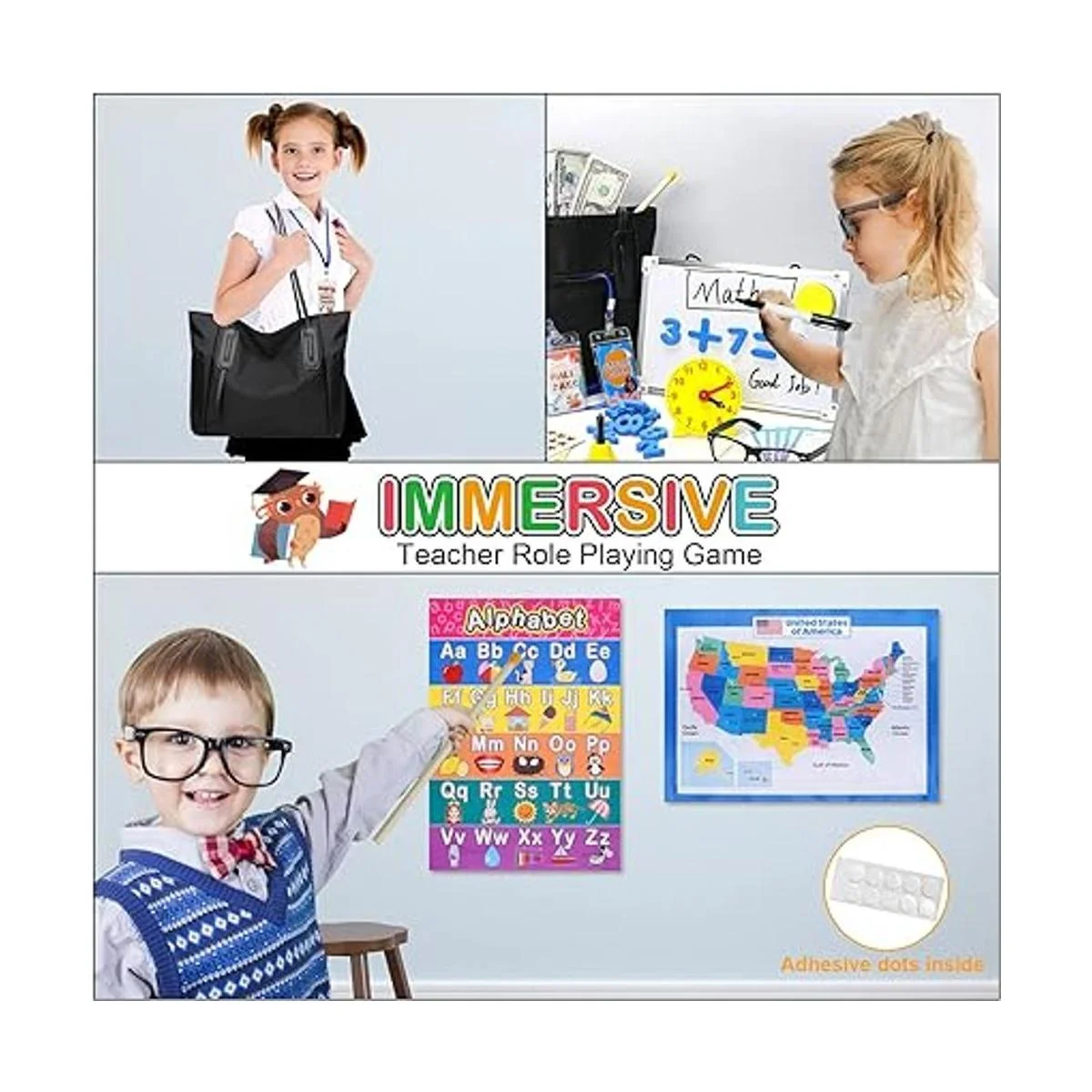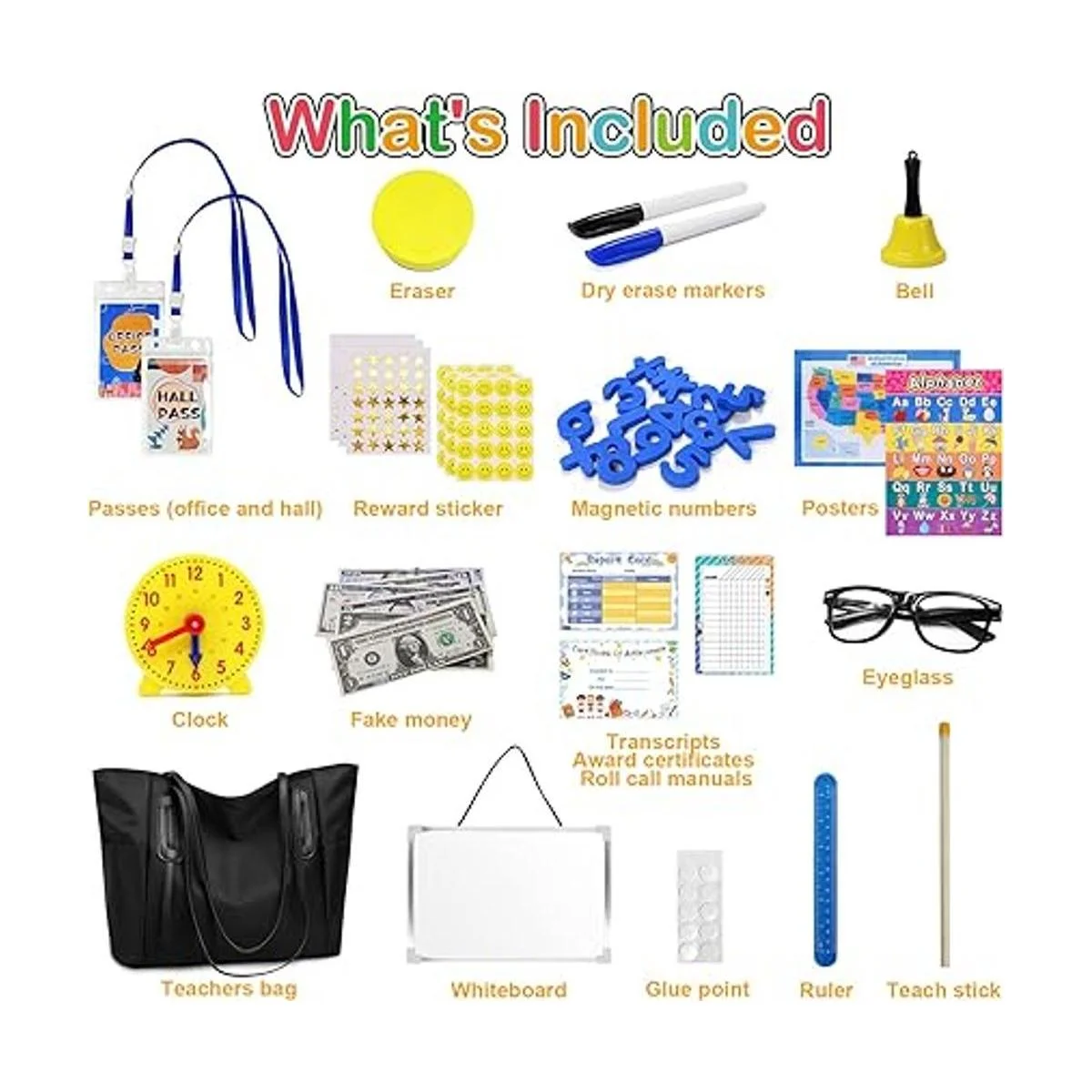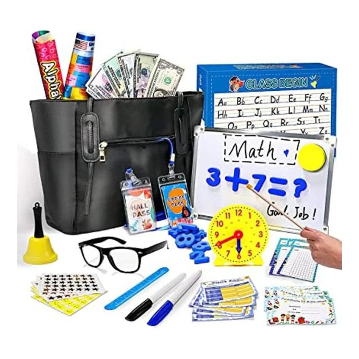 Kit realista de juego de rol para aula: está lleno de juguetes de aprendizaje y accesorios adecuados para todos los niños de 4 a 12 años. Incluye pizarra blanca, marcador de borrado en seco, borrador sonriente, números magnéticos, gafas, punteros, campanas, palos de enseñanza, reglas, dinero, carteles educativos y calcomanías de recompensa, bolsa