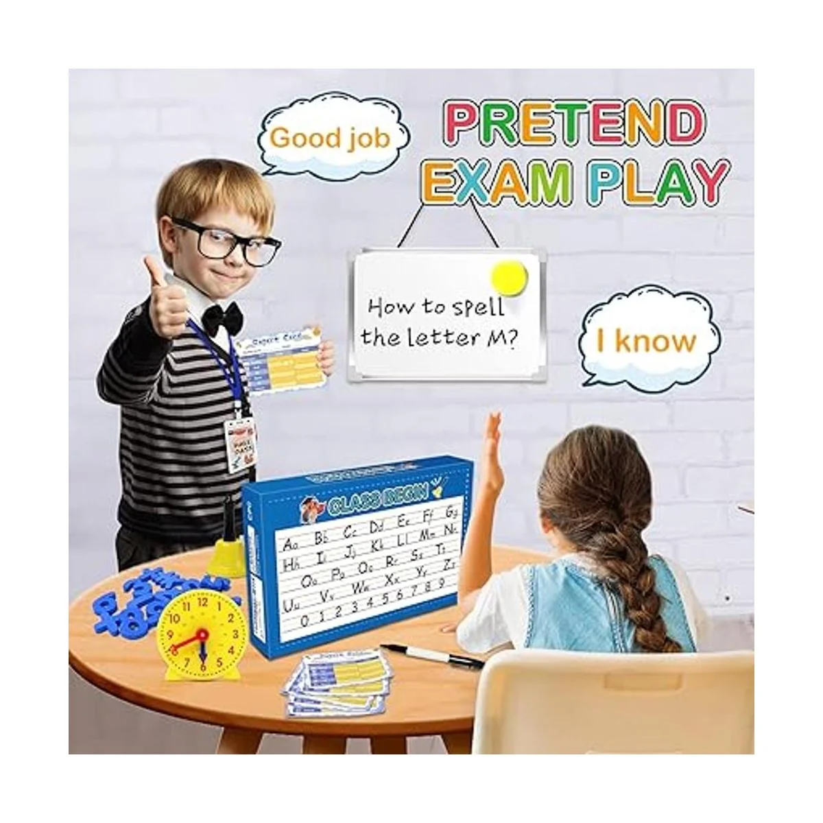 Alritz Juego de simulación para profesores, regalos de educación de aprendizaje en el aula, incluye reloj de campana de pizarra blanca reutilizable y más, sé profesor o estudiante, regalo de juguete para niños y niñas de 5, 6, 7, 8, 9, 10, 11, 12 años