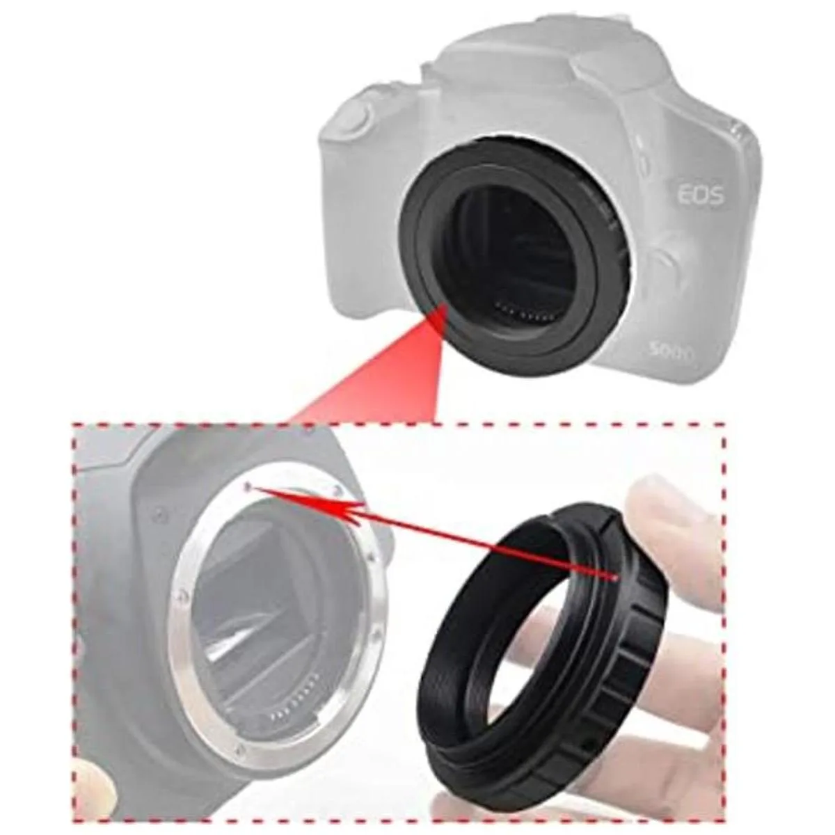 El anillo roscado combina el cuerpo de la cámara Canon EOS con la rosca en T estándar en la mayoría de los adaptadores de cámara.