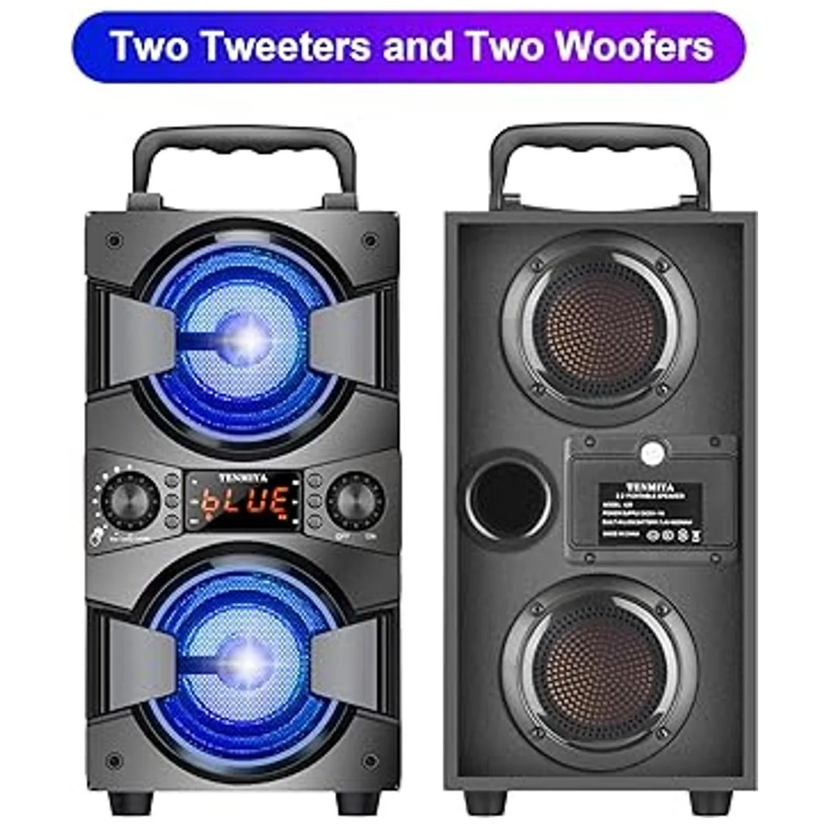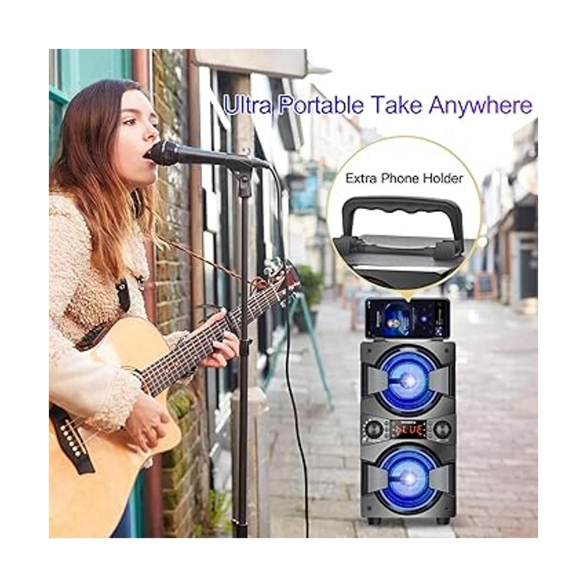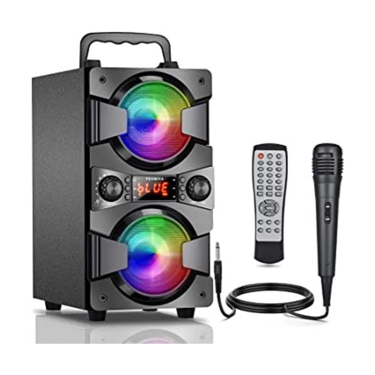 Altavoces Bluetooth con subwoofer: Más características: 1: altavoz Bluetooth con radio FM. 2: máquina de karaoke. Altavoz Bluetooth con micrófono. 3: altavoz Bluetooth con luces. 4: compatible con AUX, USB, tarjeta TF de tres formas de reproducir; 5: conectividad USB para grabar tu rendimiento o reproducir tus canciones guardadas. 6: Gran servicio al cliente, si tienes alguna pregunta, por favor envíanos un correo electrónico. comprobará nuestro buzón todos los días para responder a tus preguntas y resolverlas.