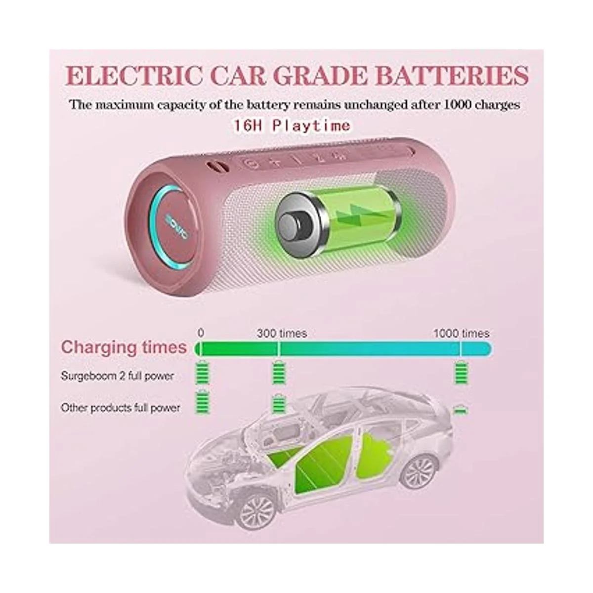 Transmisión de 16 horas más larga: batería de vehículo súper eléctrica integrada de 5000 mAh, se puede recargar más de 1000 veces, y la capacidad máxima real no se reducirá. En comparación con la batería recargable 300 veces del altavoz ordinario, la vida útil es de 3 4 veces. Disfrutemos de la música día a noche.