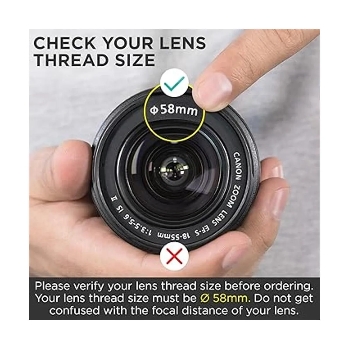 NIKON LENSES COMPATIBILITIES: Popular 58MM Lens models including Nikon AFS DX NIKKOR 55200mm f/45.6G ED VR II, Nikon AFS DX NIKKOR 35mm f/1.8G, Canon RF 35mm f/1.8 is Macro STM, Canon EFS 24mm f/2.8 STM, Canon EFM 55200mm f/4.56.3 IS STM, Sigma 30mm F1.4 Contemporary DC DN for Canon EFM, Sigma 30mm F1.4 Contemporary DC DN for Sony E, FUJIFILM XC 1545mm f/3.55.6 OIS PZ, FUJIFILM XF 35mm f/1.4 R, Panasonic Lumix G Vario 45150mm f/45.6 ASPH. MEGA O.I.S.