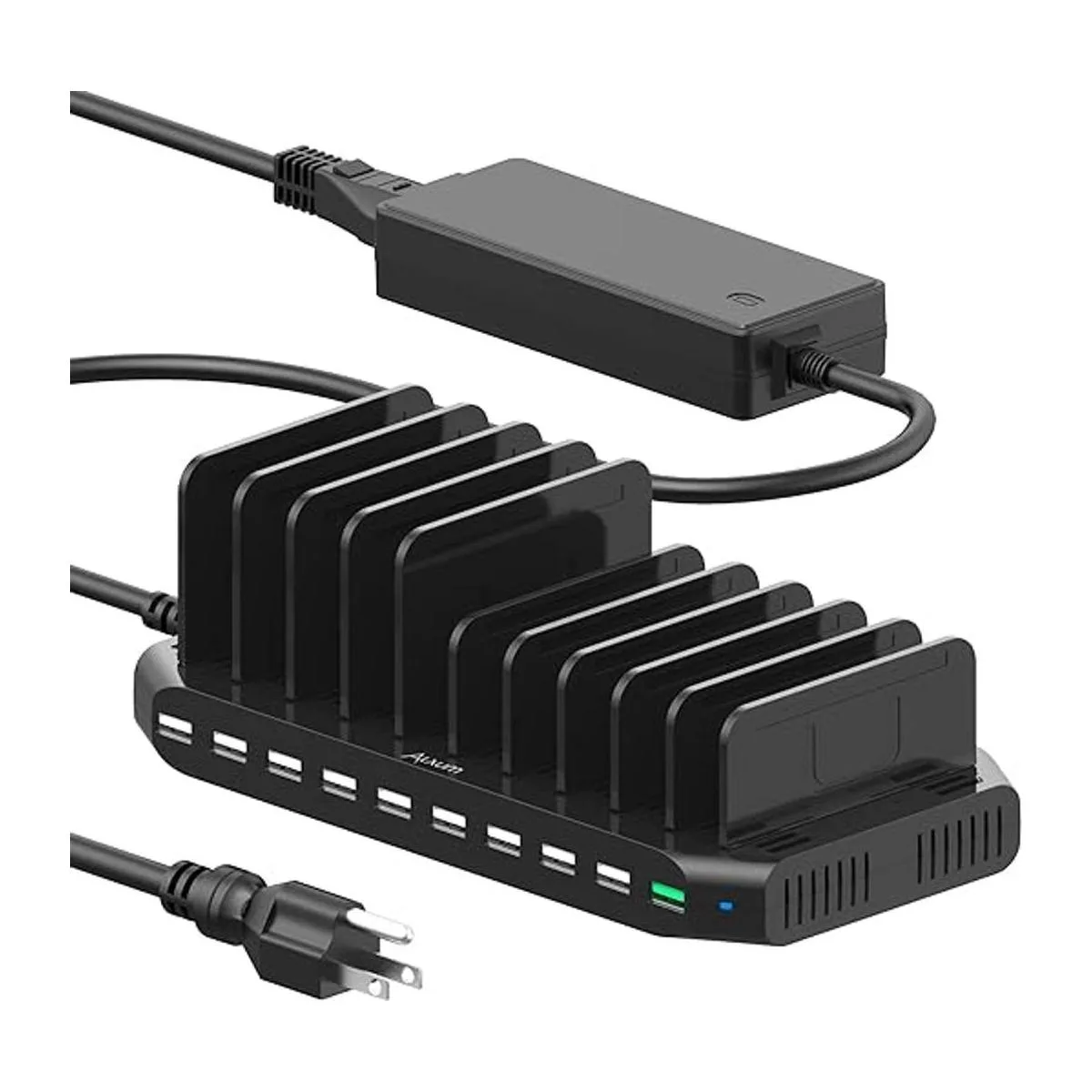 Alxum Estación de carga rápida USB con carga rápida 3.0, soporte de carga de 10 puertos para múltiples dispositivos, compatible con iPad, iPhone, Samsung Galaxy, negro