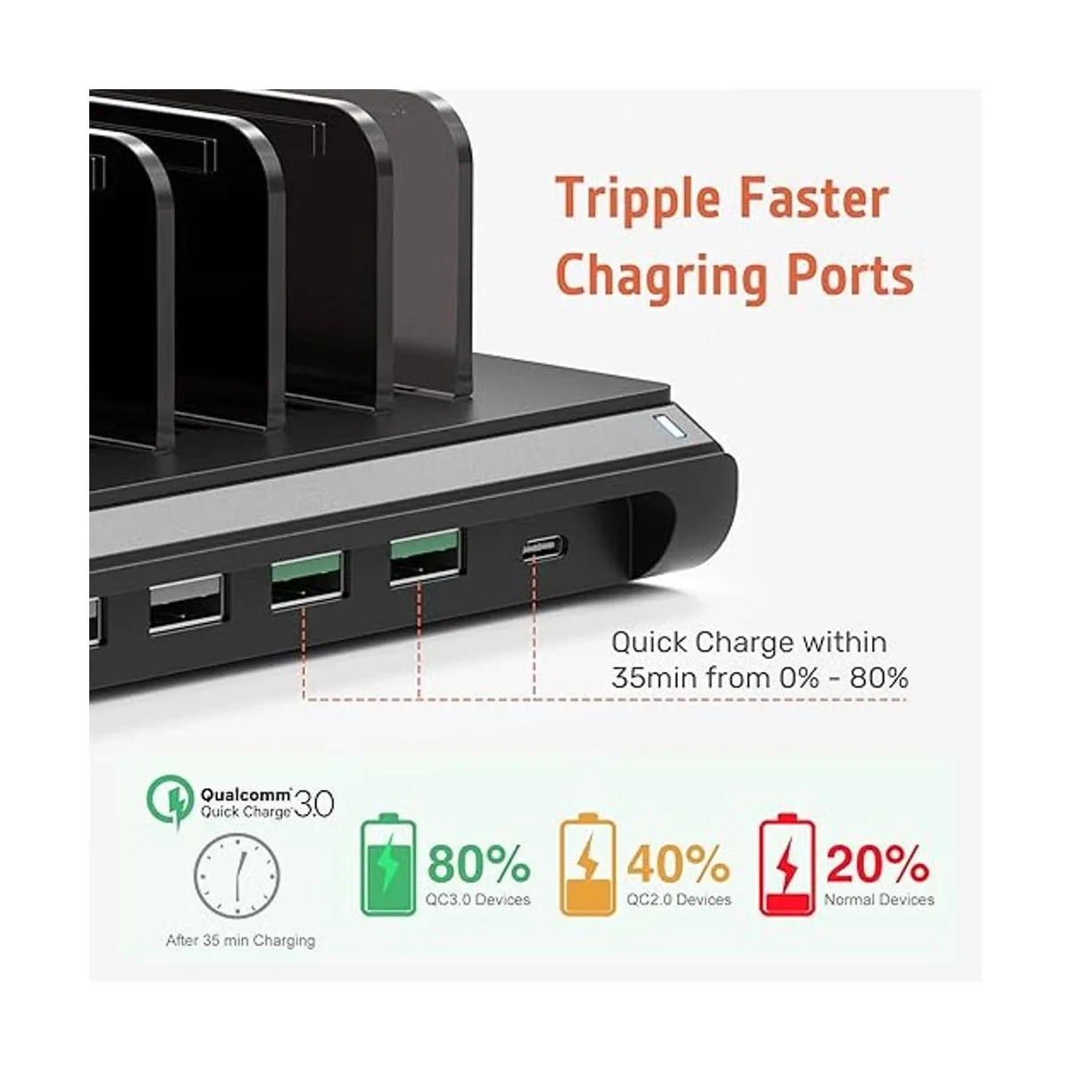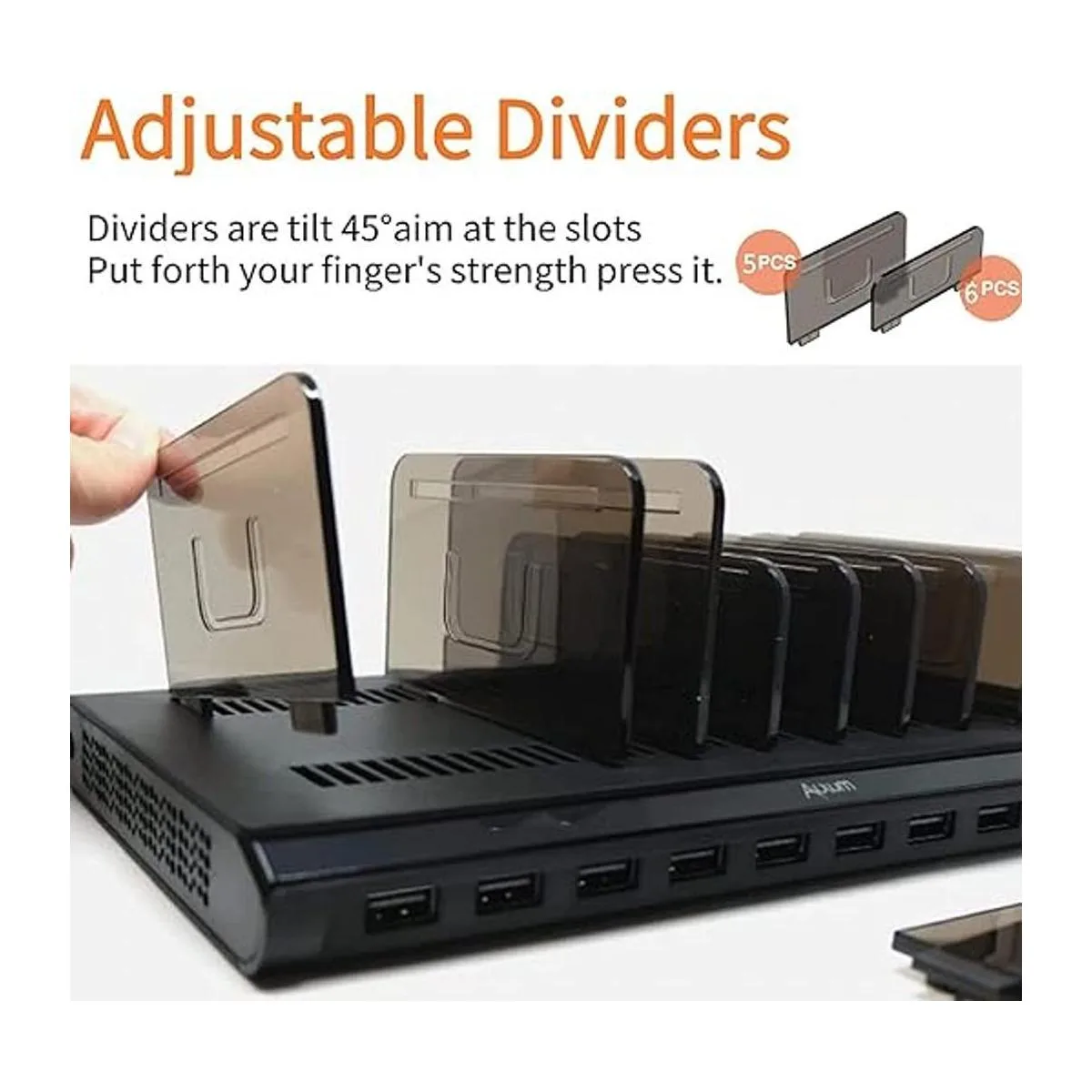 Estación de carga para múltiples dispositivos: carga hasta 10 dispositivos alimentados por USB simultáneamente, especialmente soporta 8 iPad a la vez. El puerto de carga rápida proporciona potencia de hasta 5 V 2,4 A de potencia por puerto.