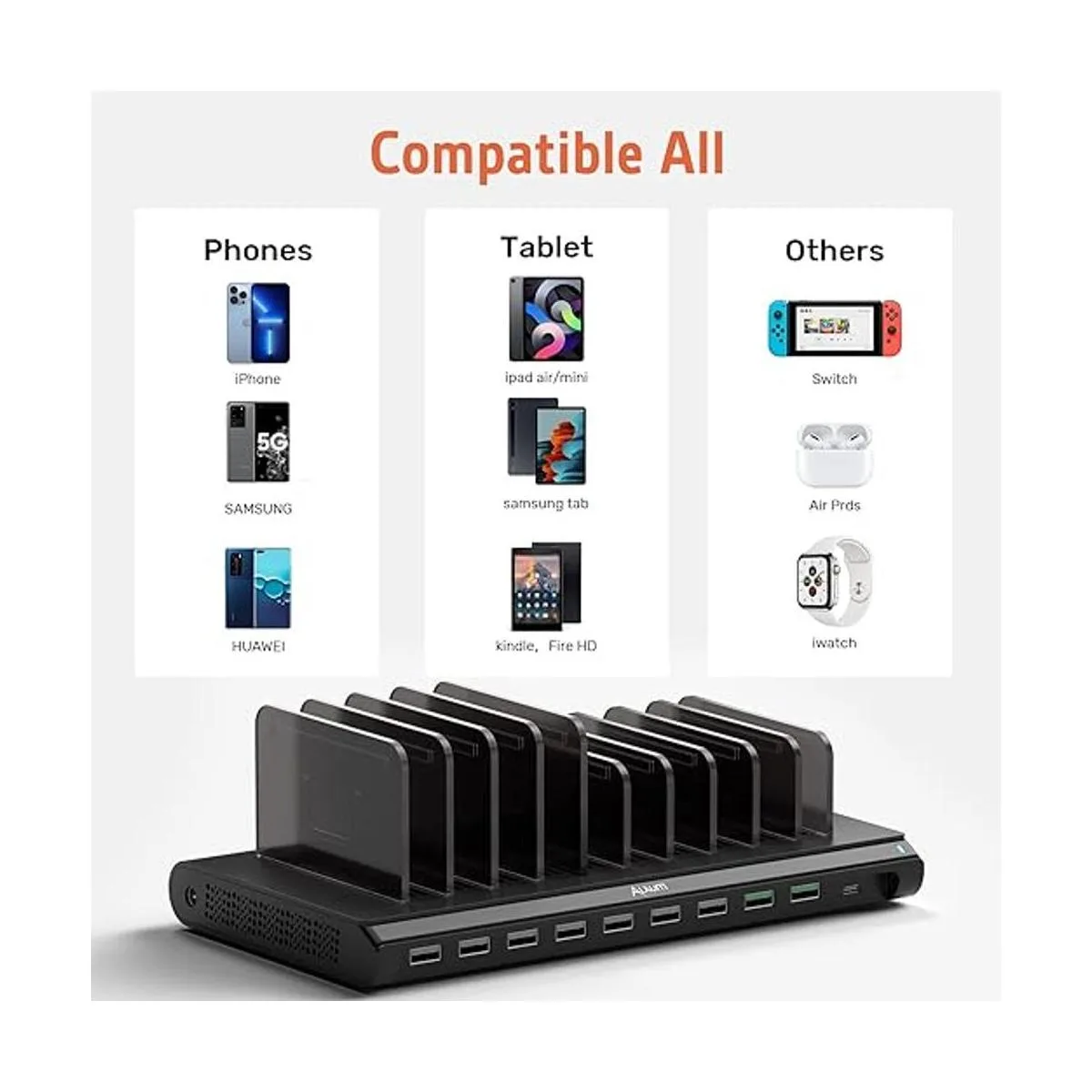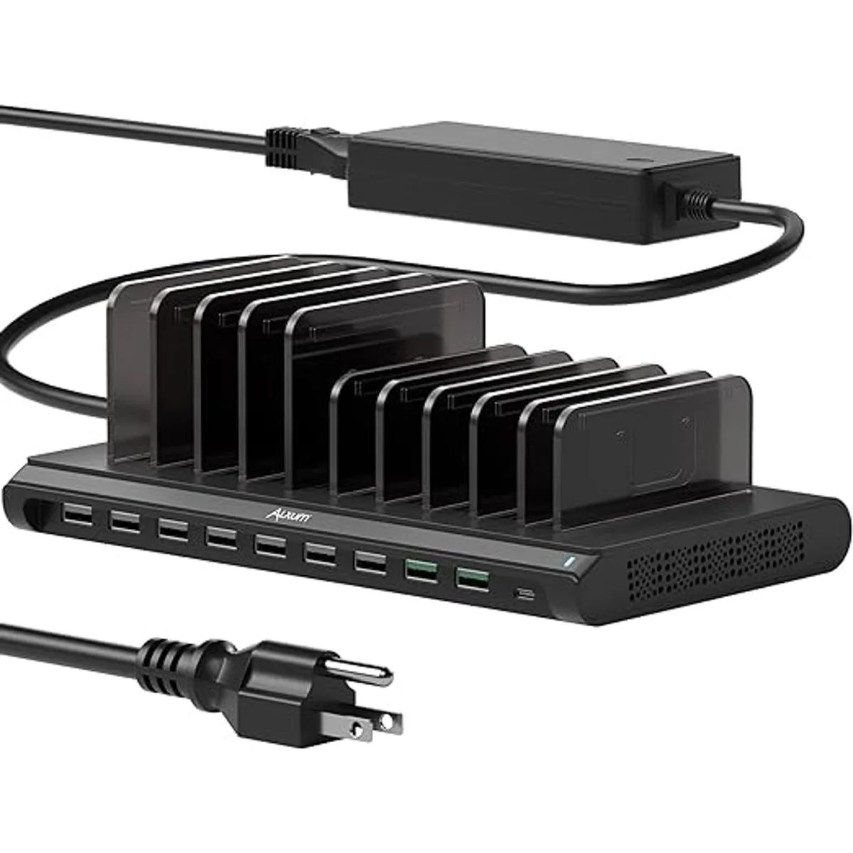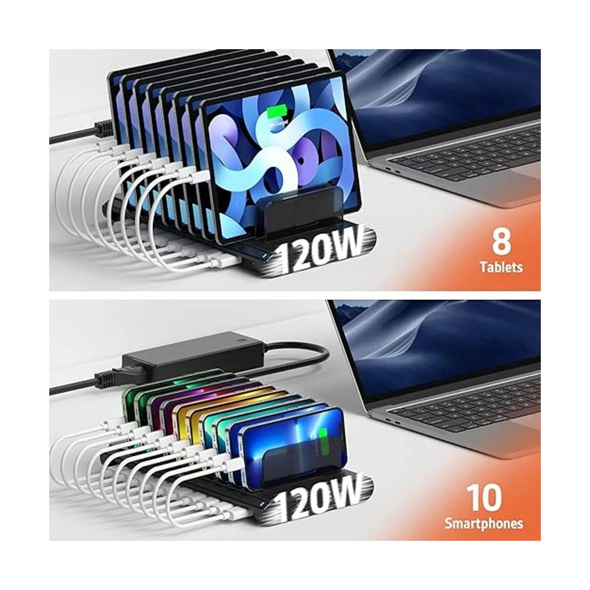 Alxum Estación de carga USB, estación de carga rápida de 120 W y 10 puertos para múltiples dispositivos con puerto tipo C2 QC 3.0 para iPadiPhoneGalaxyKindleFire, organizador de dispositivos, certificado UL, negro