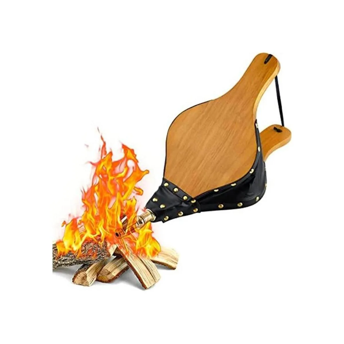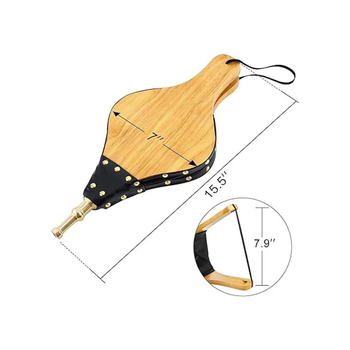 Compact efficient: Compact fire bellows with dimension of 15.5 x 7inch L x W, made of beautiful wood color finish, zinccast nozzle, crafted from thick ply board and black artificial leather look with rivets. 12.8inch long hanging strap design keeps a wider opening for large blowing capacity and round tip design get the fire roaring very quickly more substantially. Perfect handheld sized for BBQ barbecue tool kit and small enough to hang next to the fireplace, chimney and wood stove.