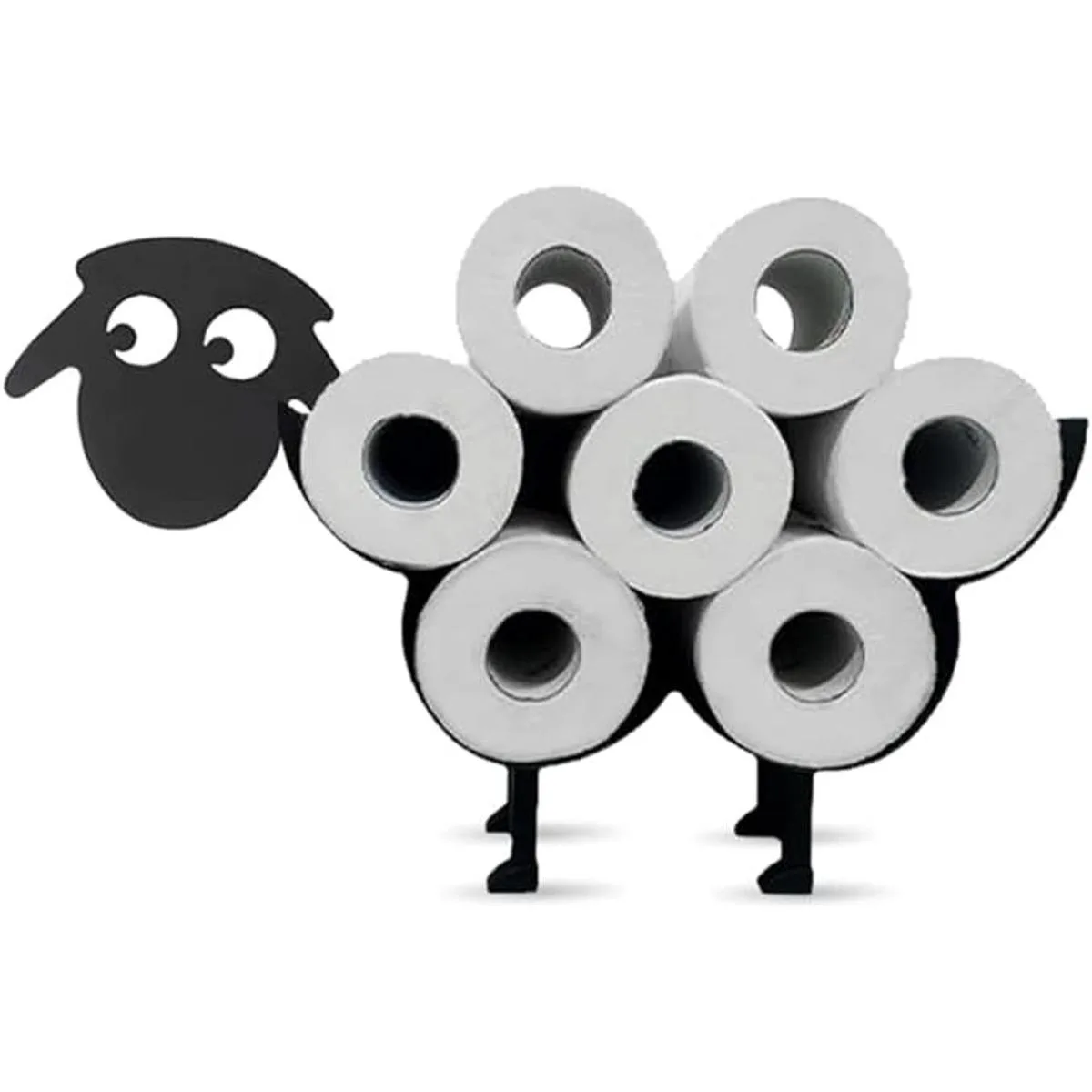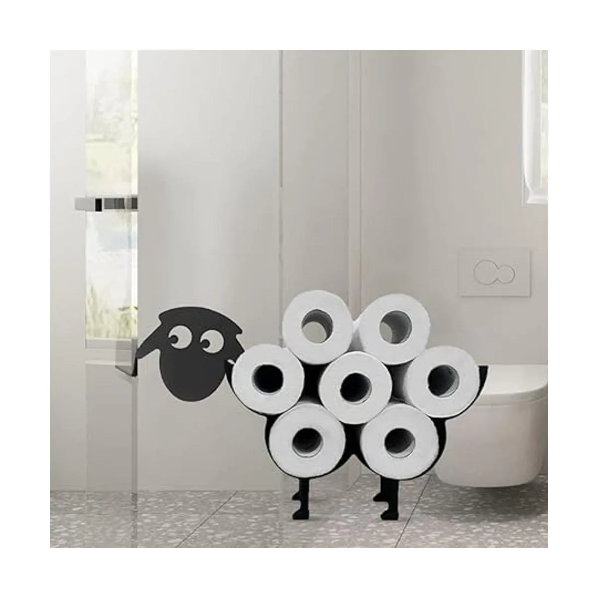 AmaQueen Soporte de rollo de papel higiénico de metal, bonito diseño de ovejas, color negro, decoración de habitación, decoración de pared, accesorios divertidos, adorno de pie y montado, 7 mega rollos de repuesto