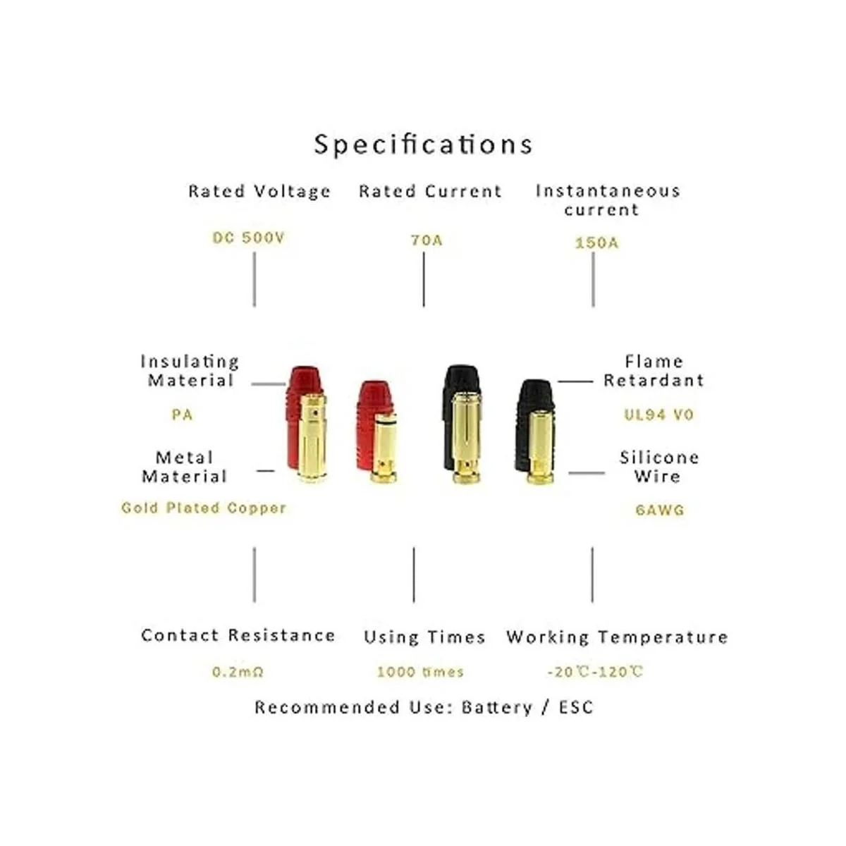 Lo que obtienes: 4 conectores de bala dorados AS150 de 0.276 in hembra, 2 conectores de bala dorados AS150 de 0.276 in macho, 2 conectores de bala dorados AS150 de 0.276 in antichispas macho, 2 carcasas rojas AS150 macho, 2 carcasas negras AS150 hembra 2 piezas AS150 0 carcasa negra masculino