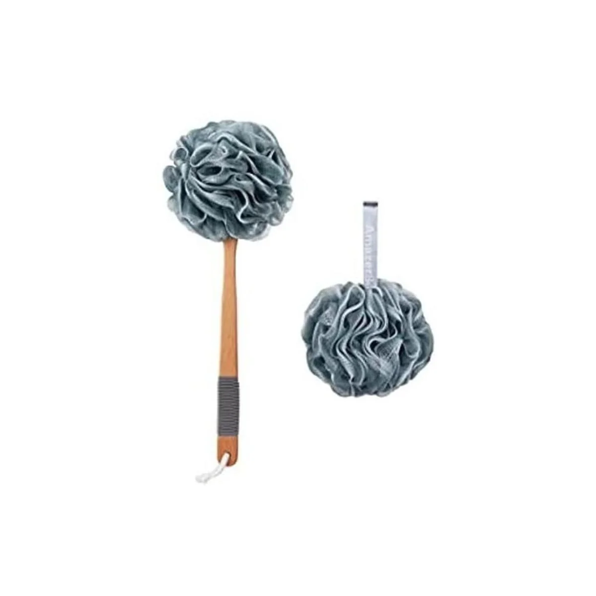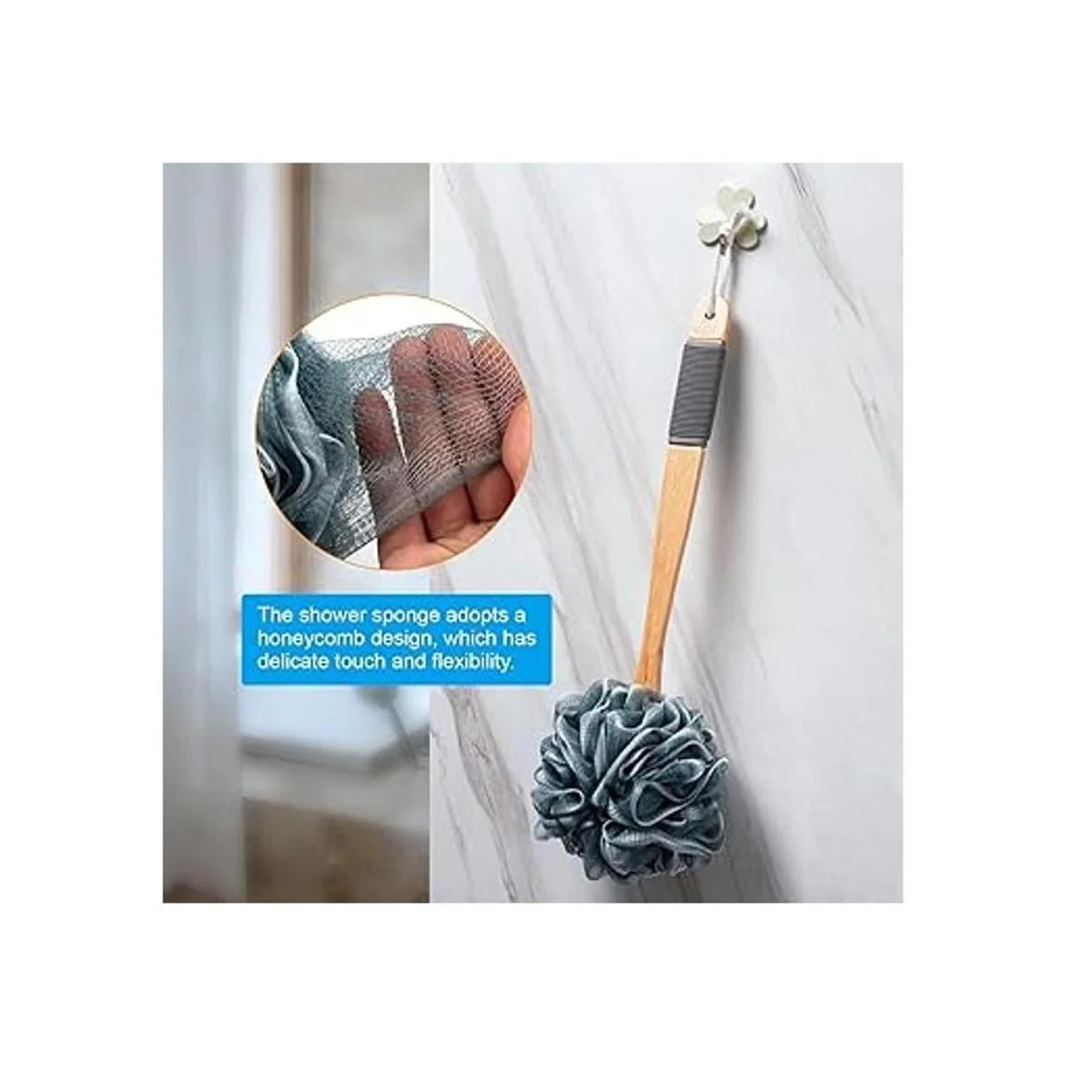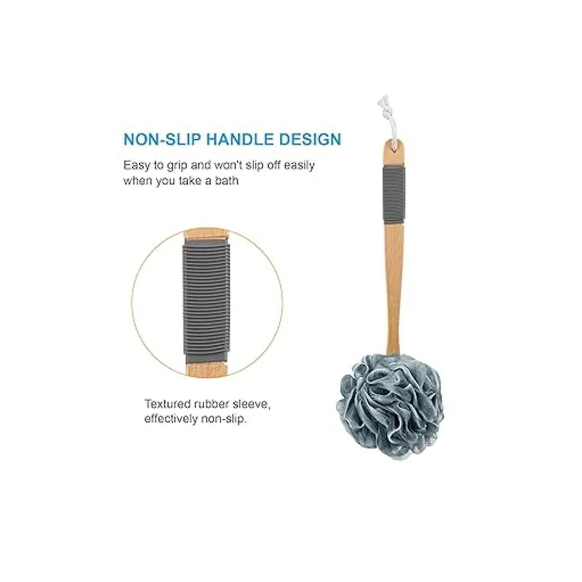 AmazerBath Esponja de ducha de lufa, exfoliante corporal de malla suave de polietileno con mango de madera largo, esponja de baño para hombres y mujeres gris
