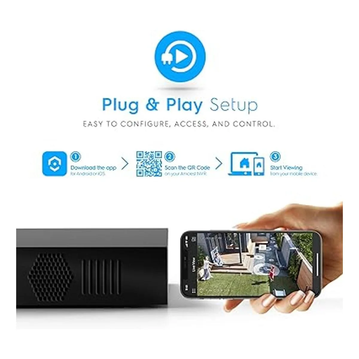 Amcrest NVR NV4108A2 de 8 canales soporta discos duros de hasta 10 TB mientras que cuenta con grabación de 8 canales y vista en vivo en resolución de hasta 8 MP/4K a tiempo real de 30 fps. Reproducción de 8 canales 1080p 30 fps/4 canales 4MP 30 fps/2 canales 4K 30 fps. Compatible con todas las cámaras WiFi y IP con cable Amcrest y compatibilidad limitada con cámaras IP compatibles con marcas de terceros.