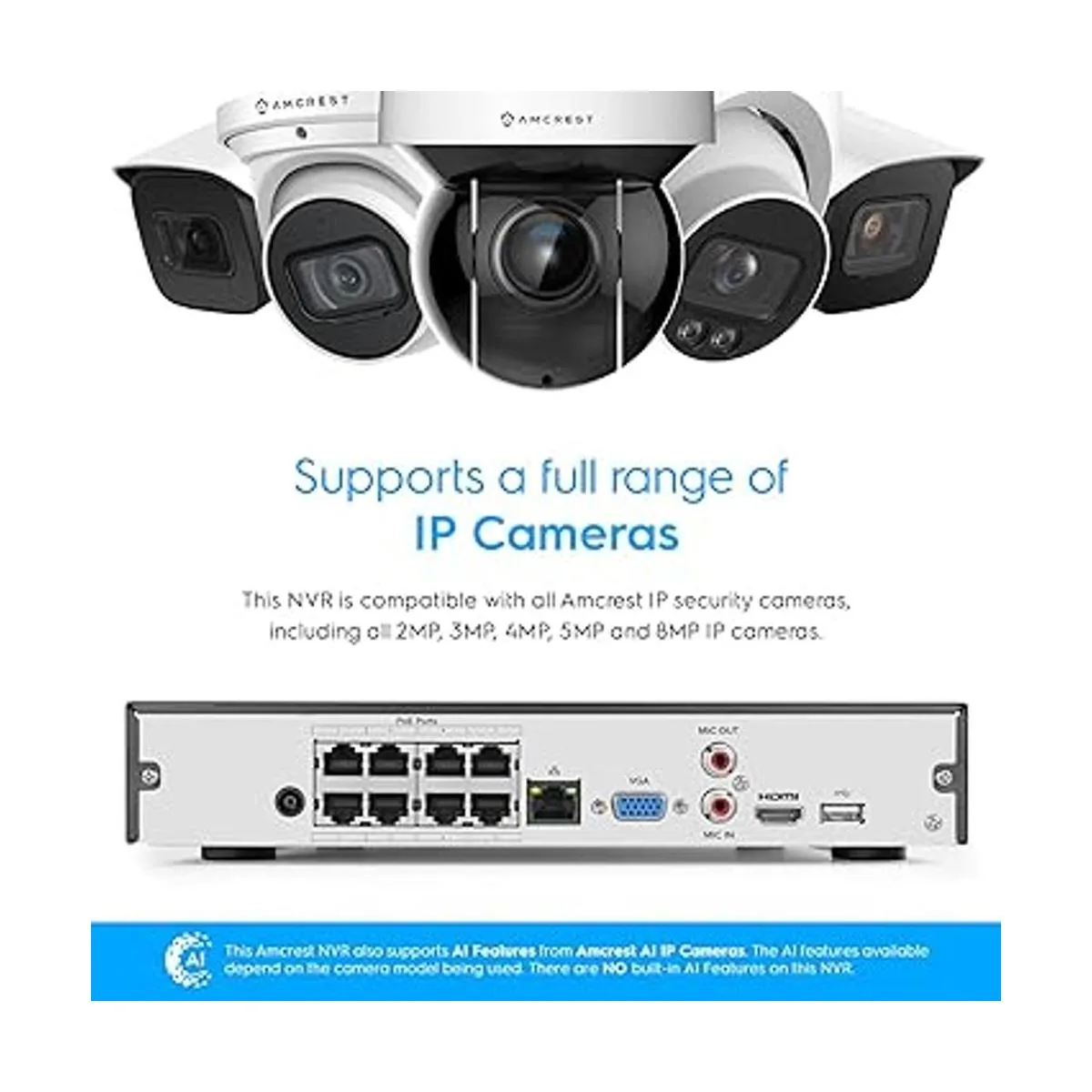 Amcrest NV4108EA2 4K 8CH POE NVR 1080p3MP4MP5MP8MP grabadora de vídeo en red POE Soporta hasta 8 cámaras IP de 8MP4K, alimentación de 8 canales a través de Ethernet soporta hasta 10 TB HDD no incluido