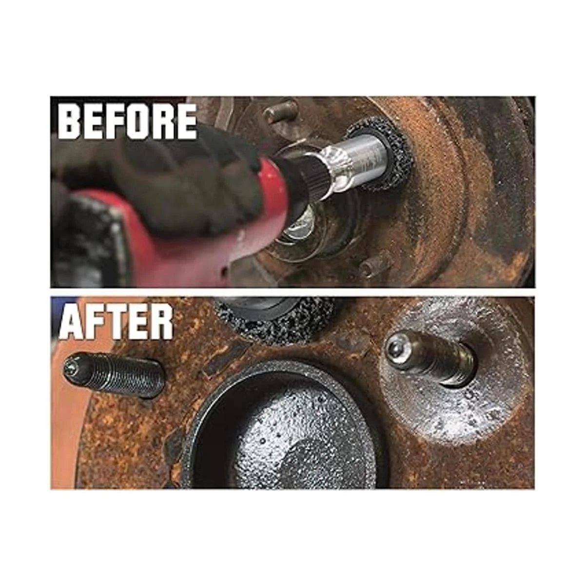 La almohadilla abrasiva limpia alrededor del perno de la rueda y la superficie del buje