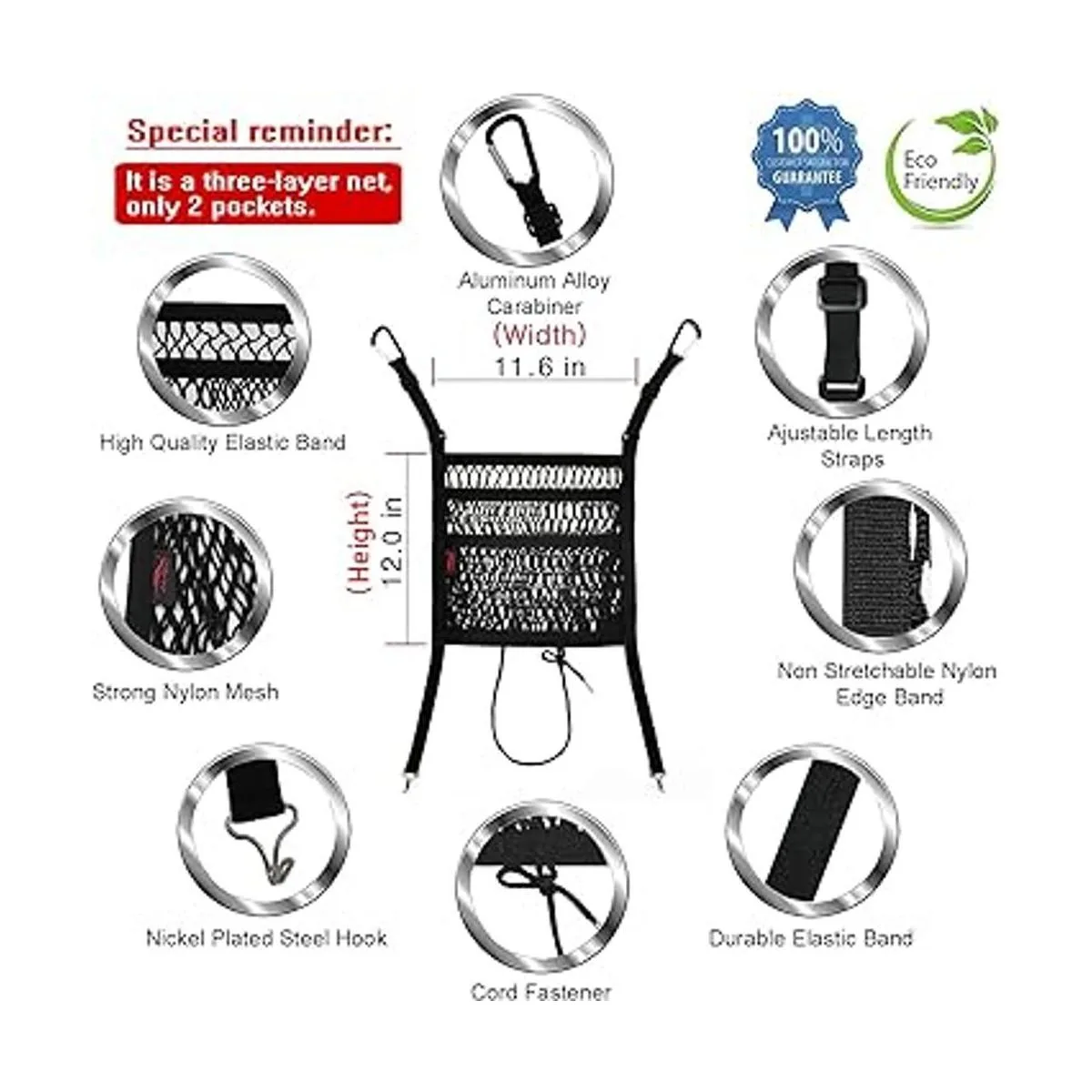 La longitud de las 2 correas superiores es ajustable, y el material de nailon no es elástico: adecuado para diferentes tipos de coches, y evita la flacidez general debido al peso de la bolsa de malla.