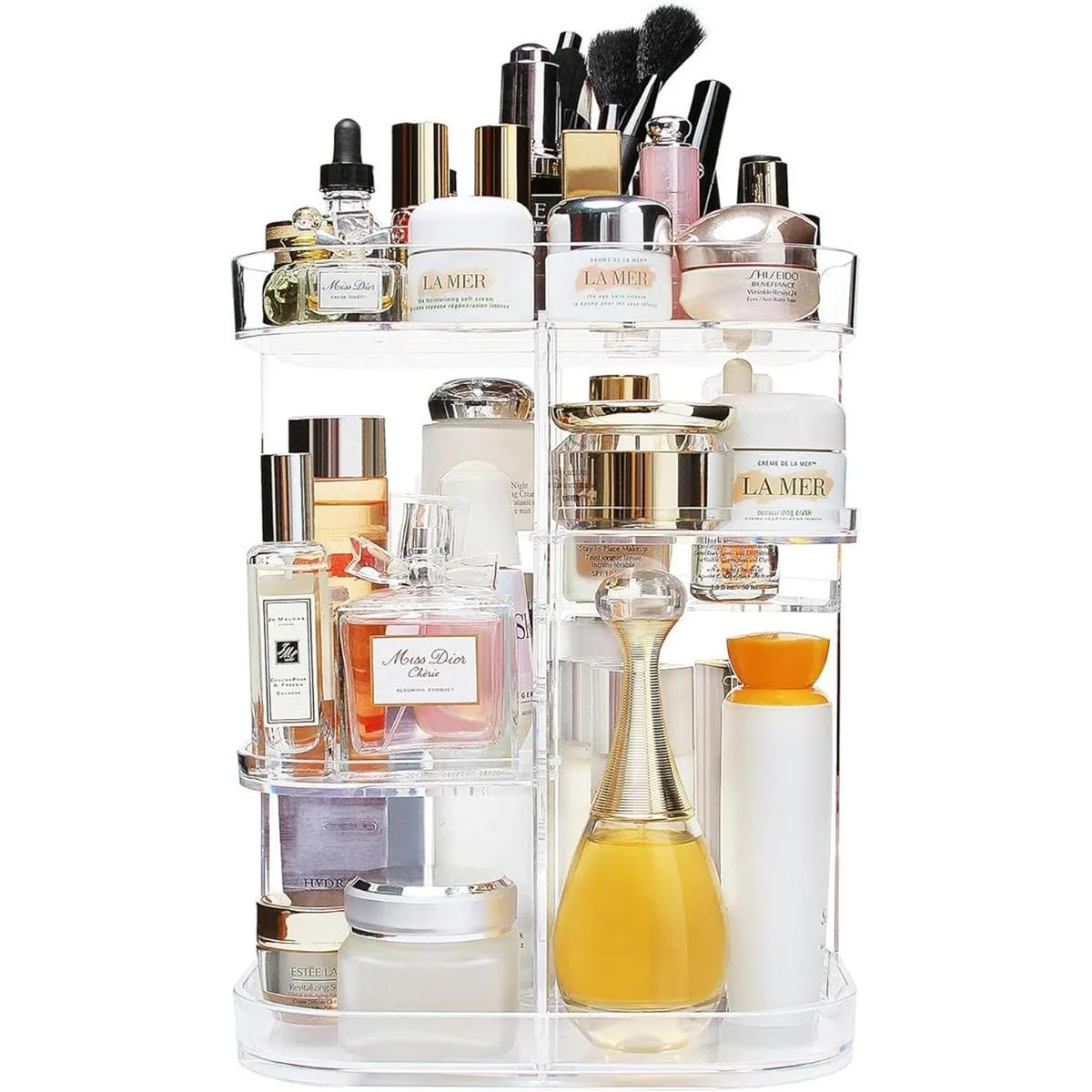 Gran capacidad: mide 12.6 pulgadas de altura y 8.7 pulgadas de diámetro base cuando está montado. El compartimento superior es bueno para esmalte de uñas, pintalabios, cortaúñas, brochas de maquillaje y mucho más. Botellas de capa media para el cuidado de la piel, botella de perfume, lavados.