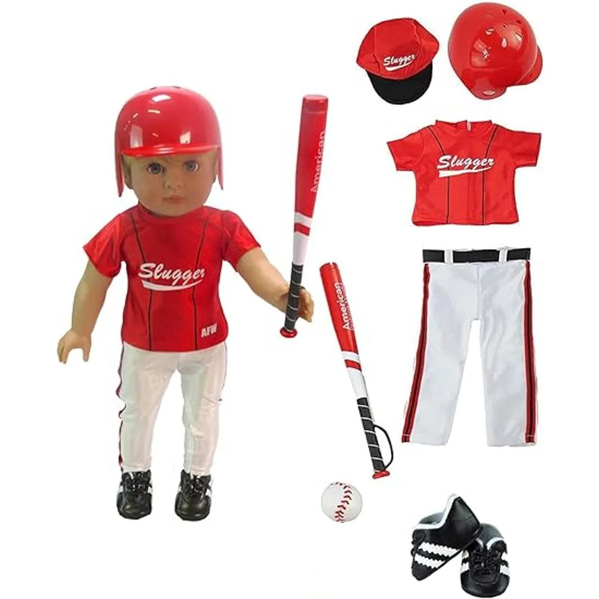 American Fashion World Uniforme de béisbol rojo con accesorios hecho para adaptarse a muñecas de 18 pulgadas como muñecas American Girl