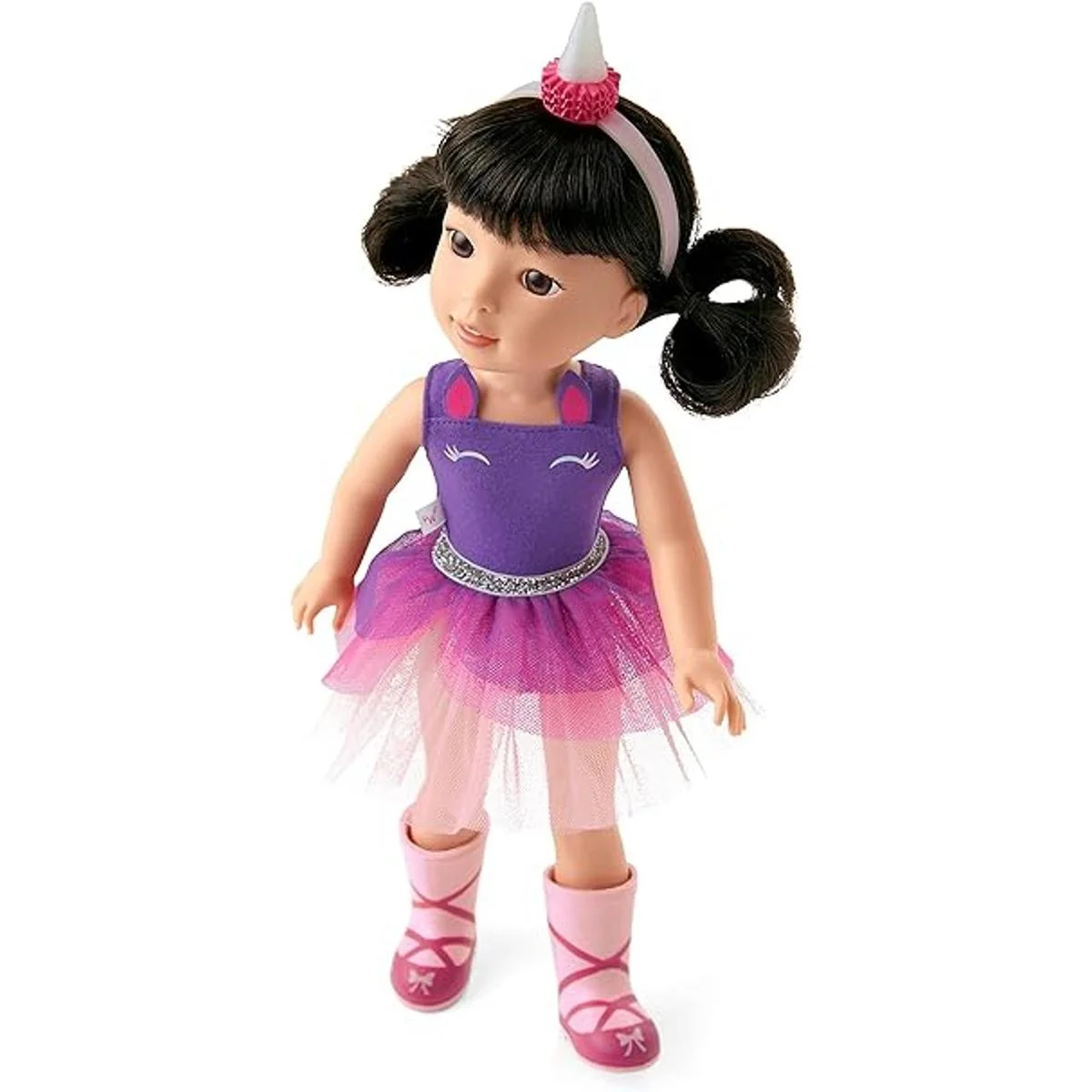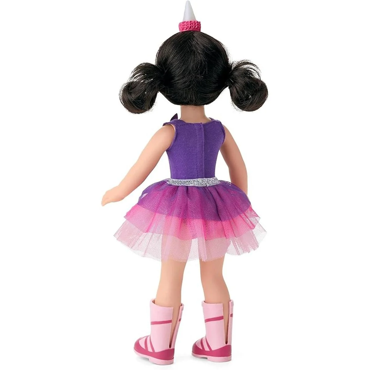 Una muñeca Emerson de 14.5 pulgadas que tiene el tamaño perfecto para las niñas más jóvenes. Tiene ojos marrones oscuros y cabello negro en coletas rizadas