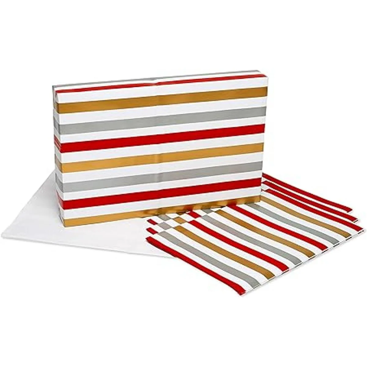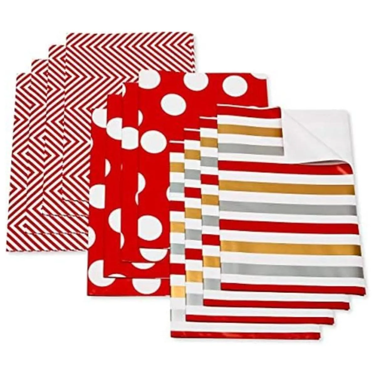 Este juego de papel de regalo para todas las ocasiones incluye patrones de rayas atrevidas, lunares y zigzag en colores rojo, blanco, dorado y plateado