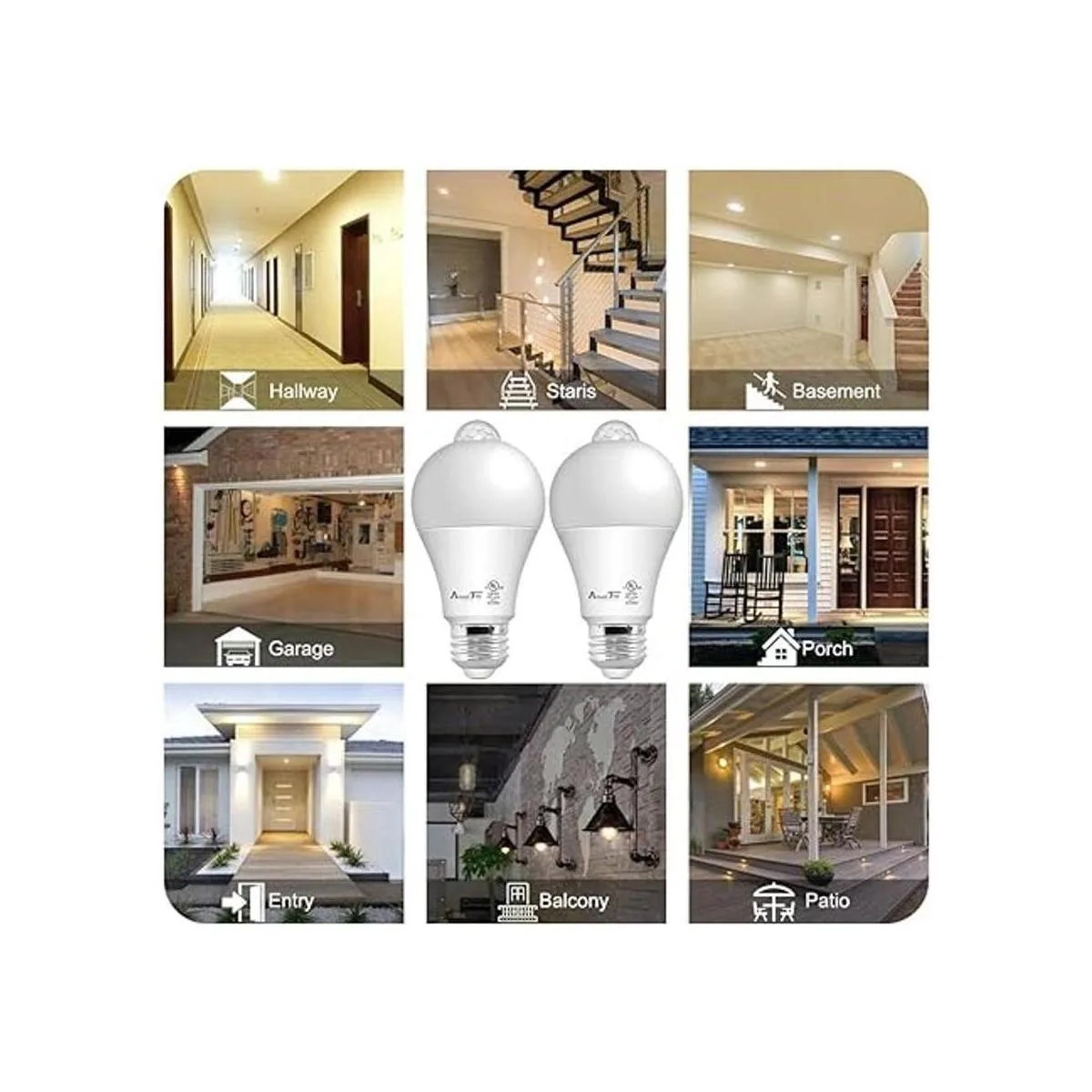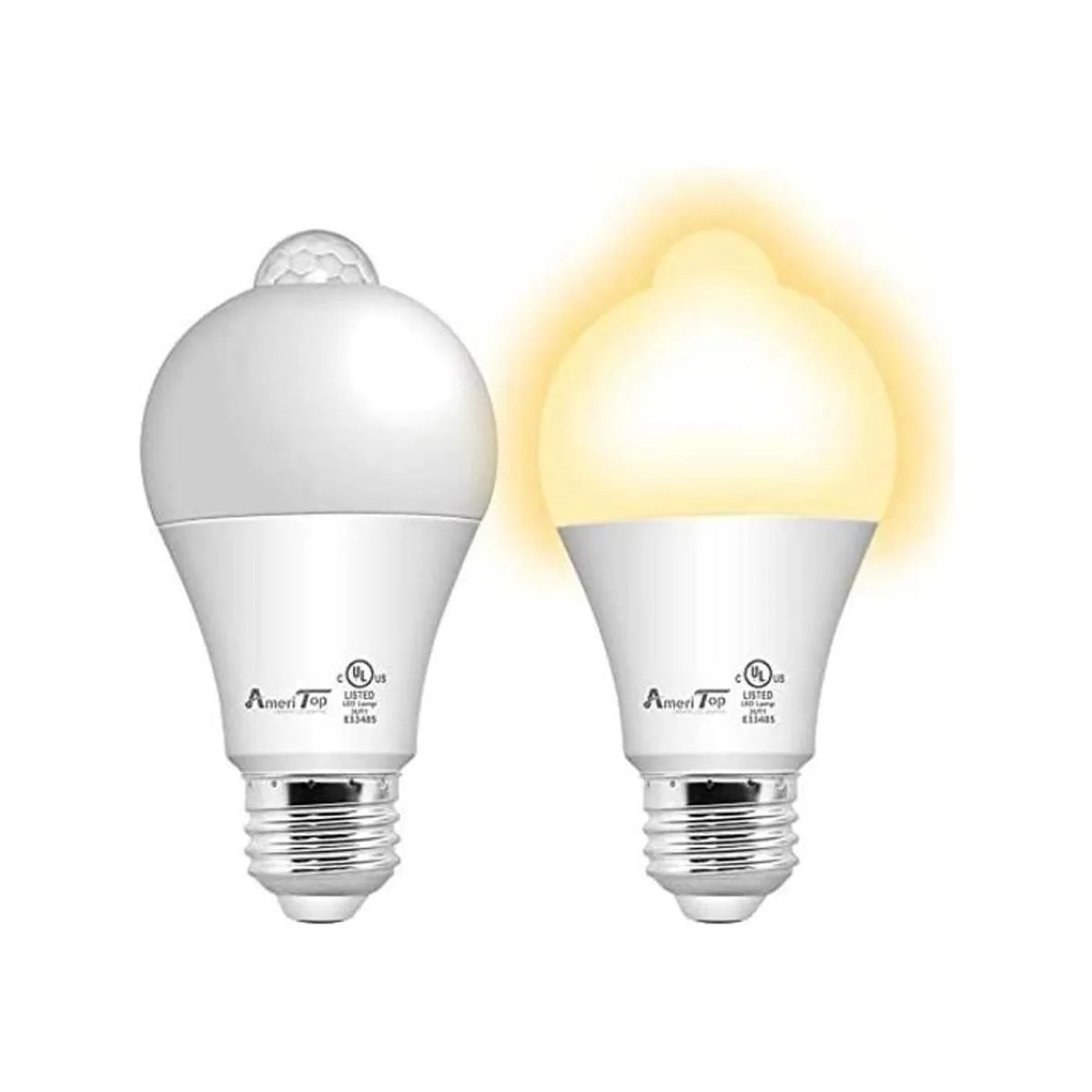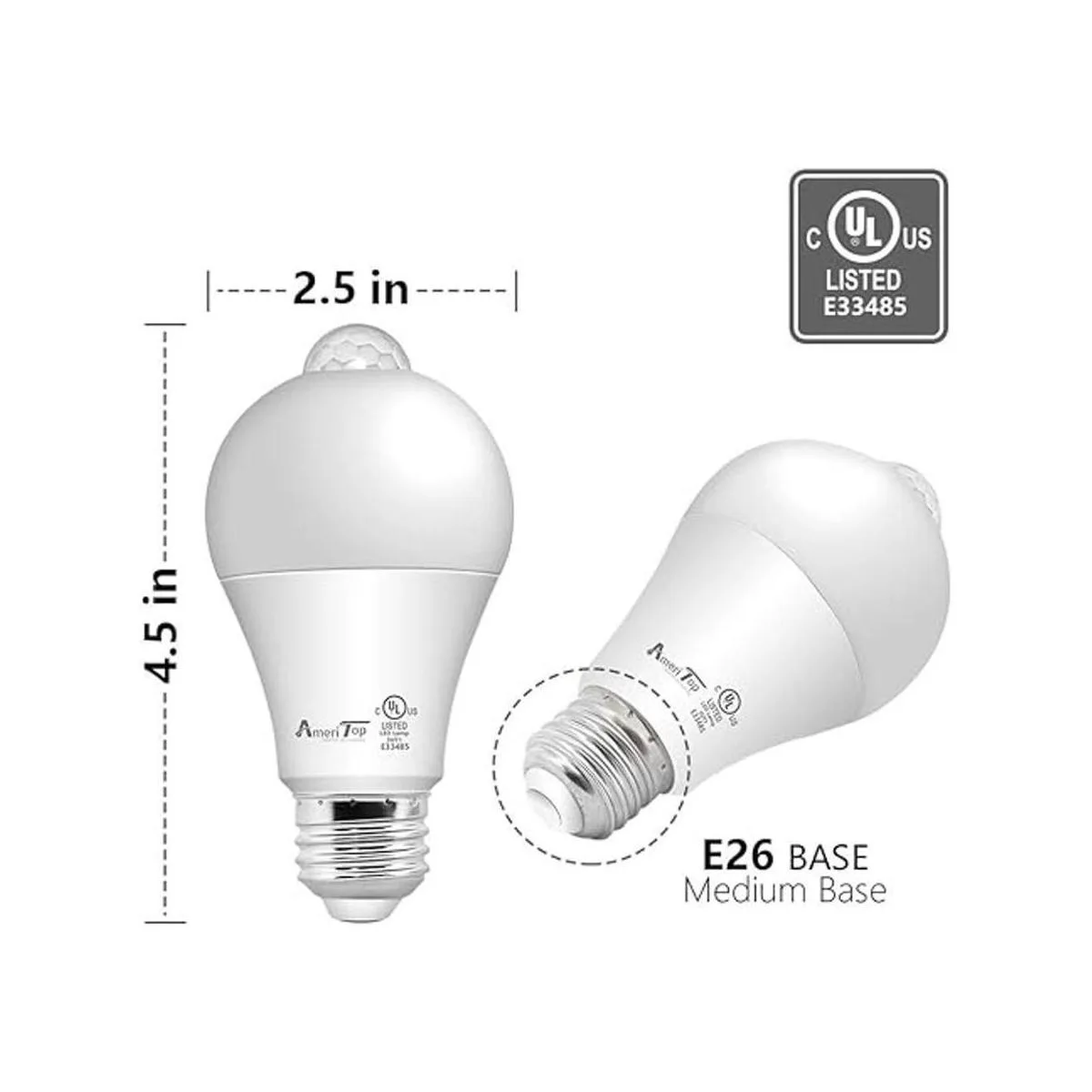 AmeriTop Bombilla con sensor de movimiento, 2 unidades, 10 W equivalente a 60 W 806 lm activada por movimiento de atardecer a amanecer, bombilla LED de seguridad con certificación UL, A19, E26, encendido y apagado automático para interiores y exteriores 2700 K blanco suave