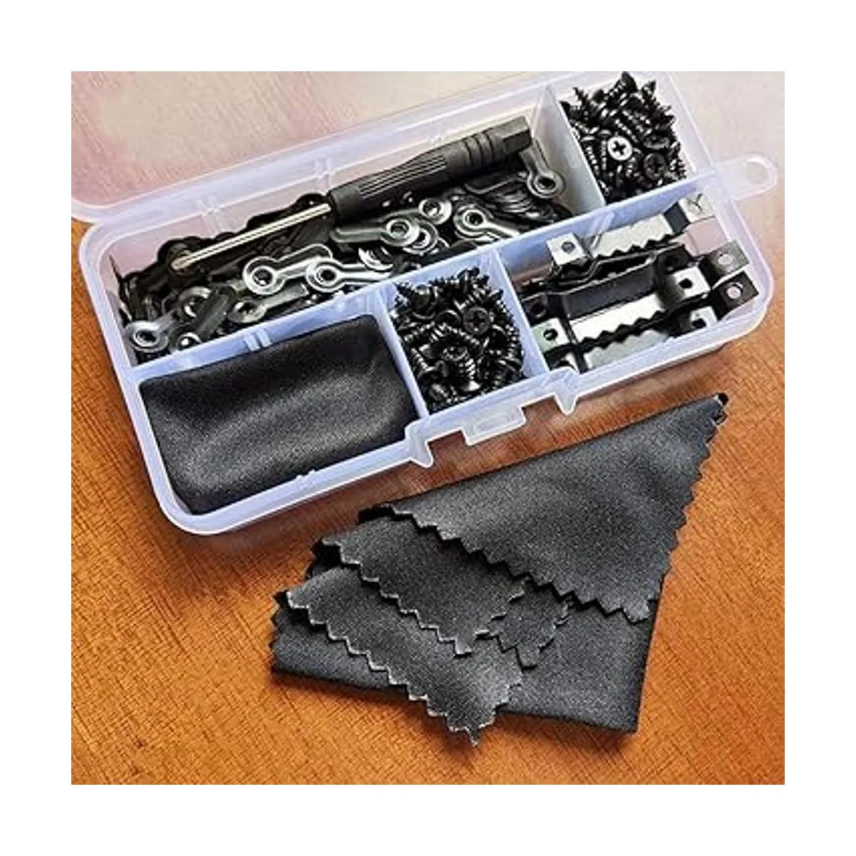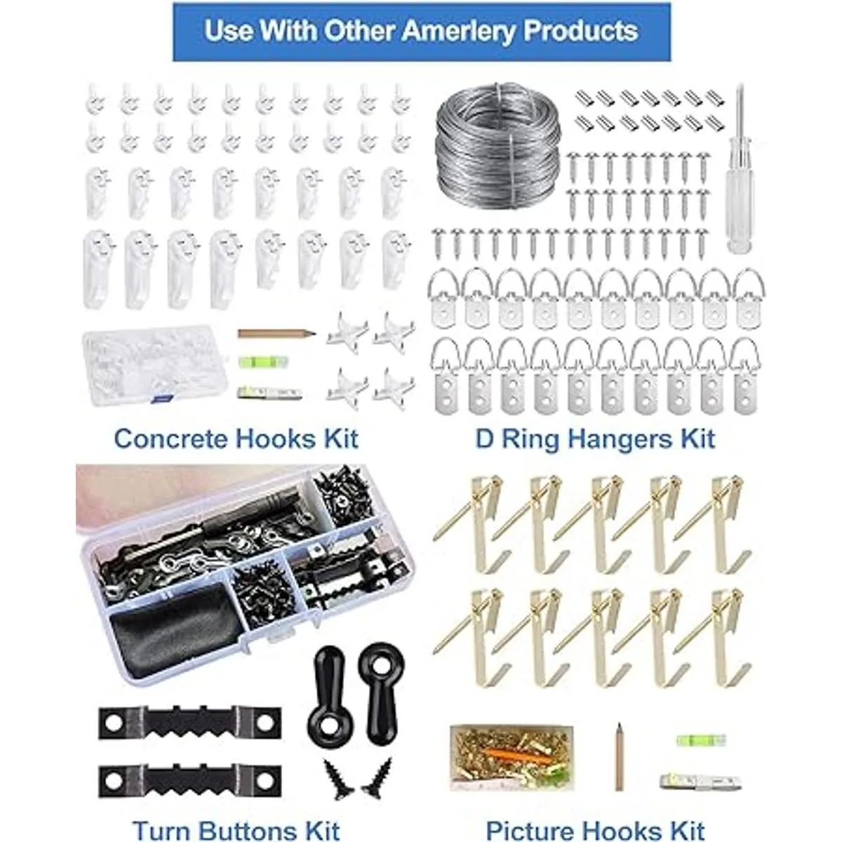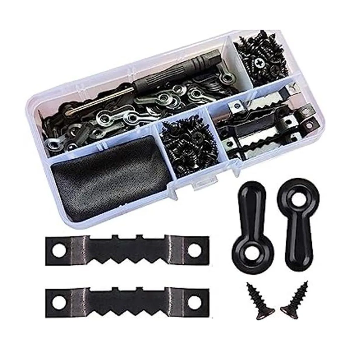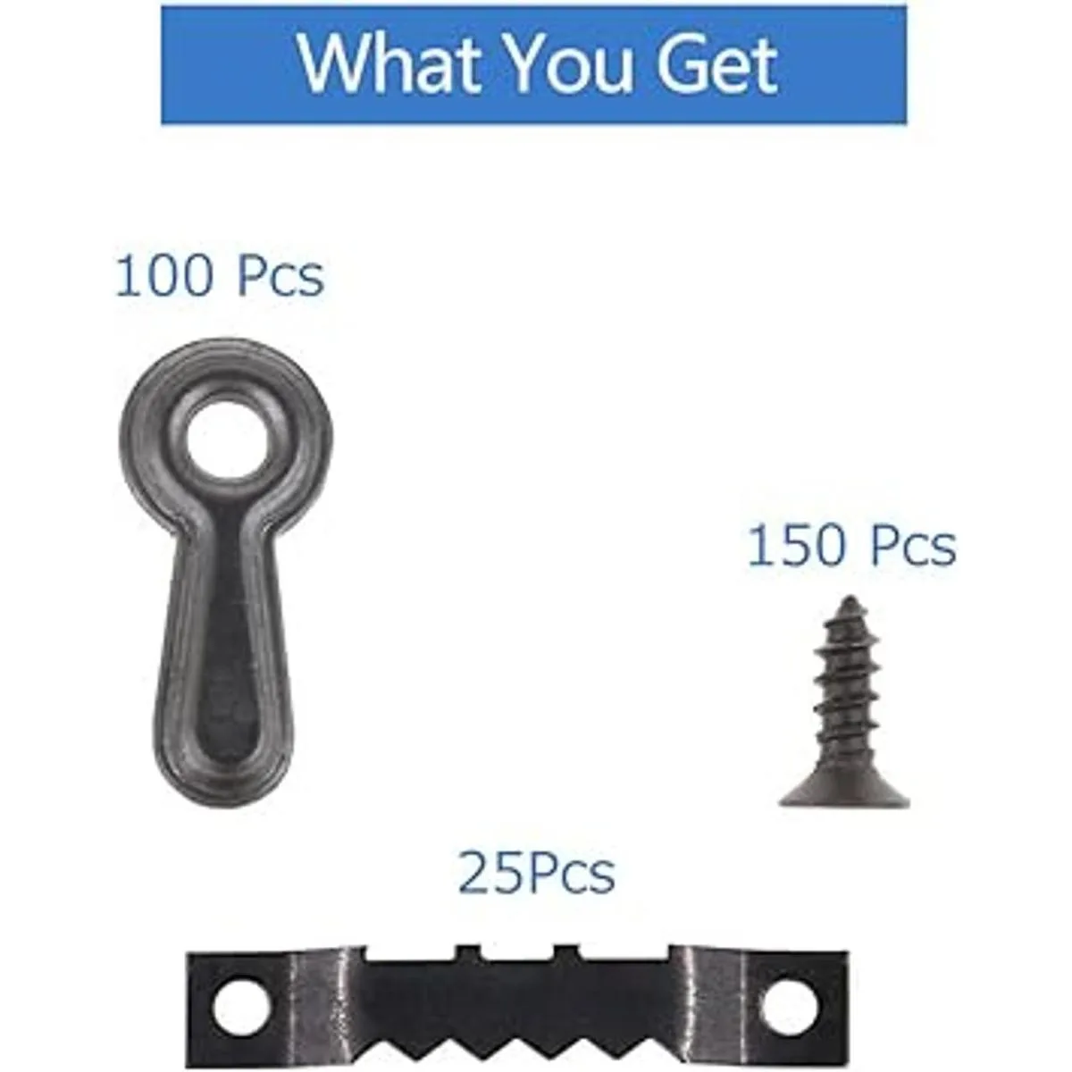 El kit para colgar marcos de fotos incluye 25 accesorios para colgar marcos de fotos con dientes de sierra, 100 botones de giro para marcos de fotos, 150 clavos y 1 caja de almacenamiento