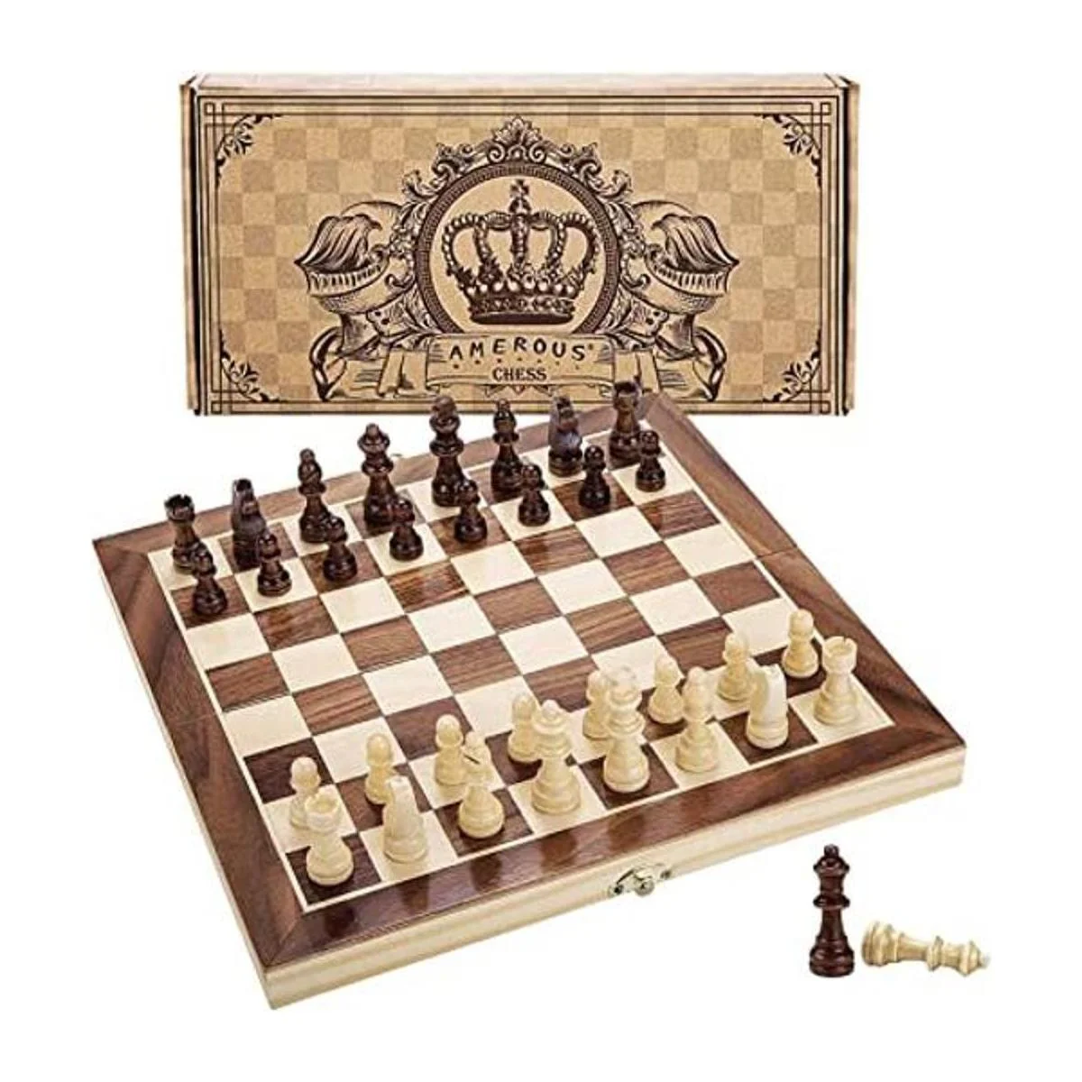 AMEROUS Juego de ajedrez magnético de madera de 12 x 12 pulgadas para adultos y niños, 2 reinas adicionales, tablero plegable con ranuras de almacenamiento, piezas de ajedrez hechas a mano, juegos de mesa de ajedrez de viaje portátiles, caja empacada de regalo