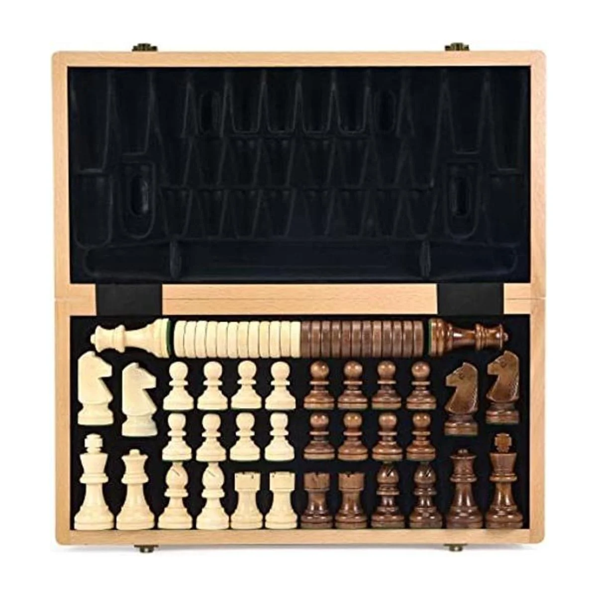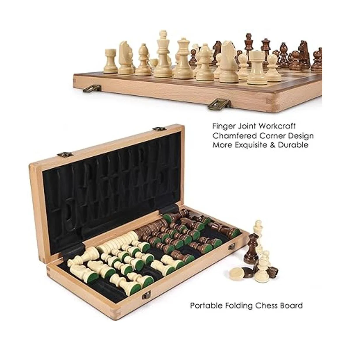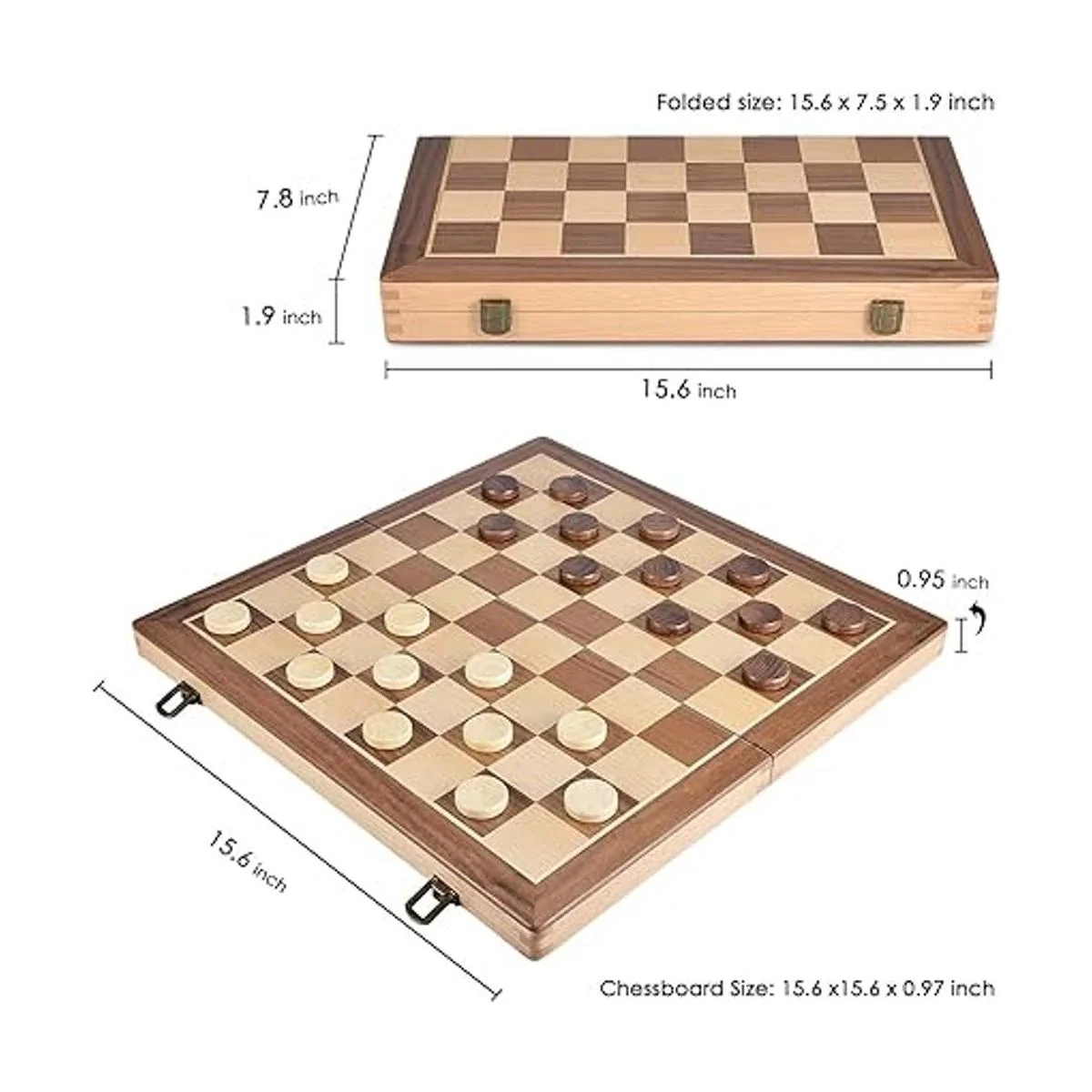 AMEROUS Juego de ajedrez y damas de madera de 15 pulgadas con piezas de ajedrez ponderadas mejoradas, 2 extra Queen, 24 piezas de cherkers, tablero plegable, instrucciones idioma español no garantizado Ranuras de almacenamiento de ajedrez, juegos de mesa clásicos 2 en 1