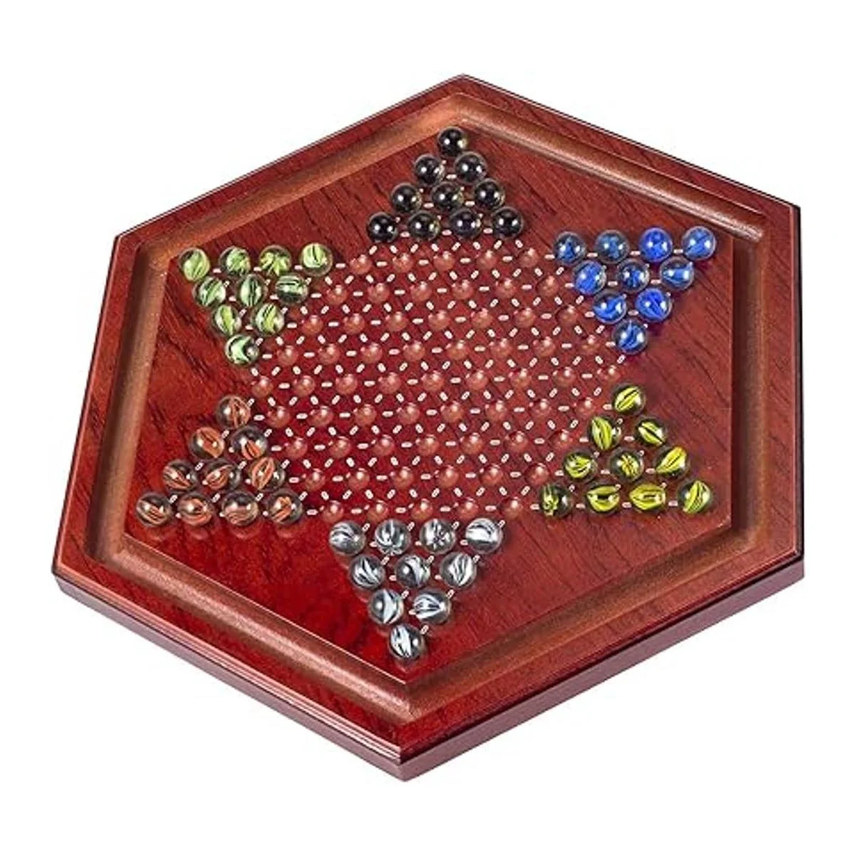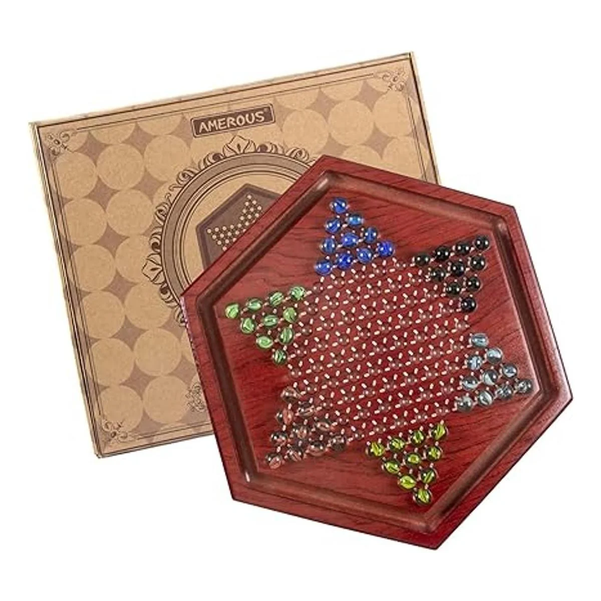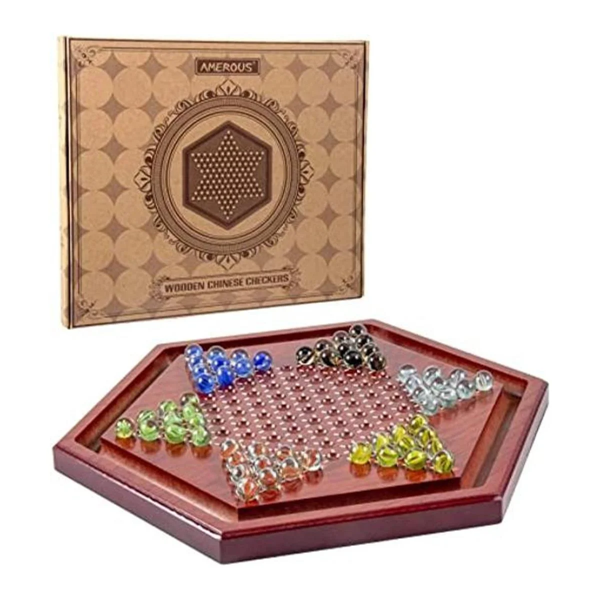 AMEROUS Juego de mesa chino de madera de 13.6 pulgadas con 60 canicas de vidrio coloridas, juego de estrategia clásico para niños, adultos, juego familiar hasta seis jugadores