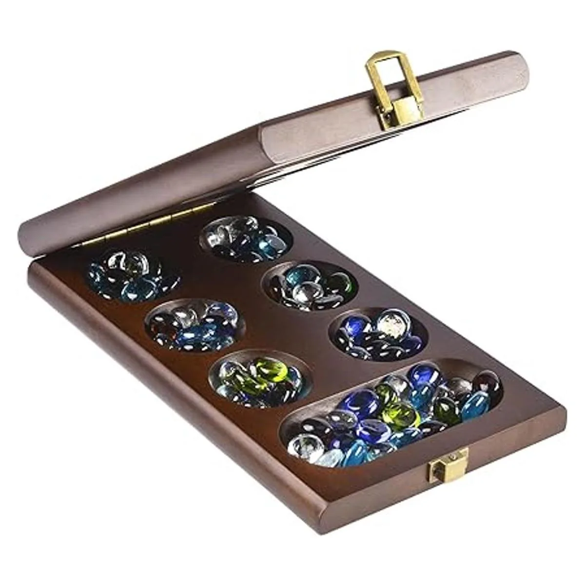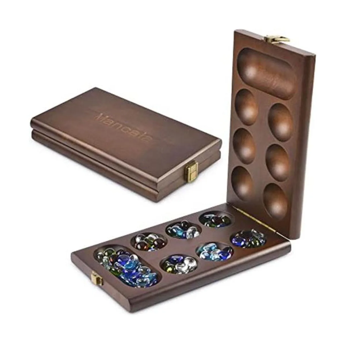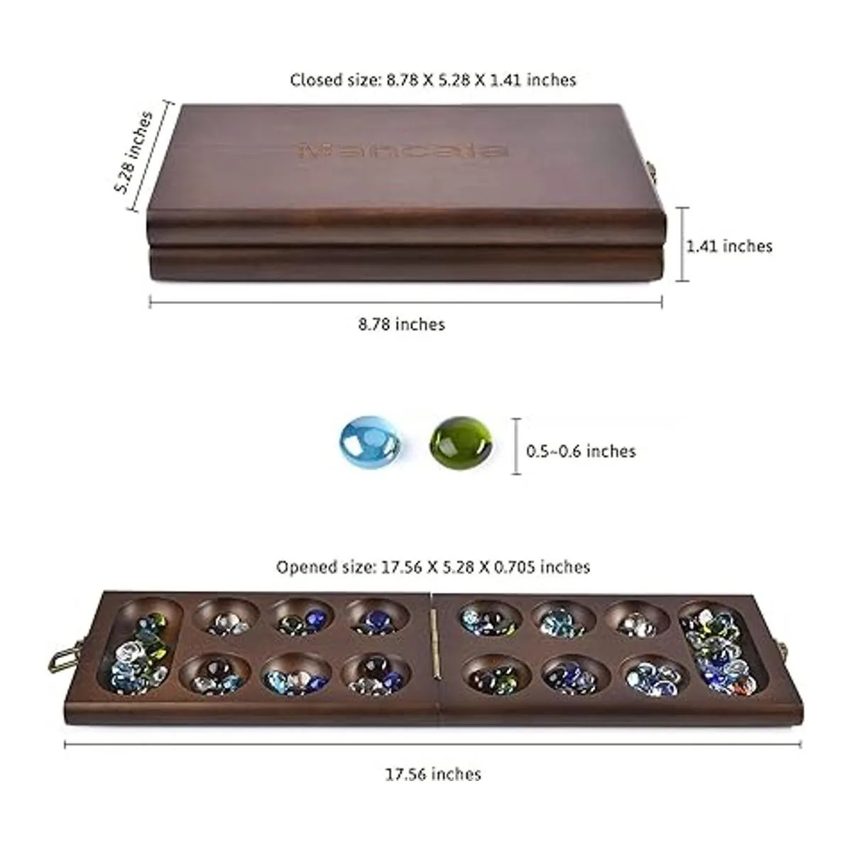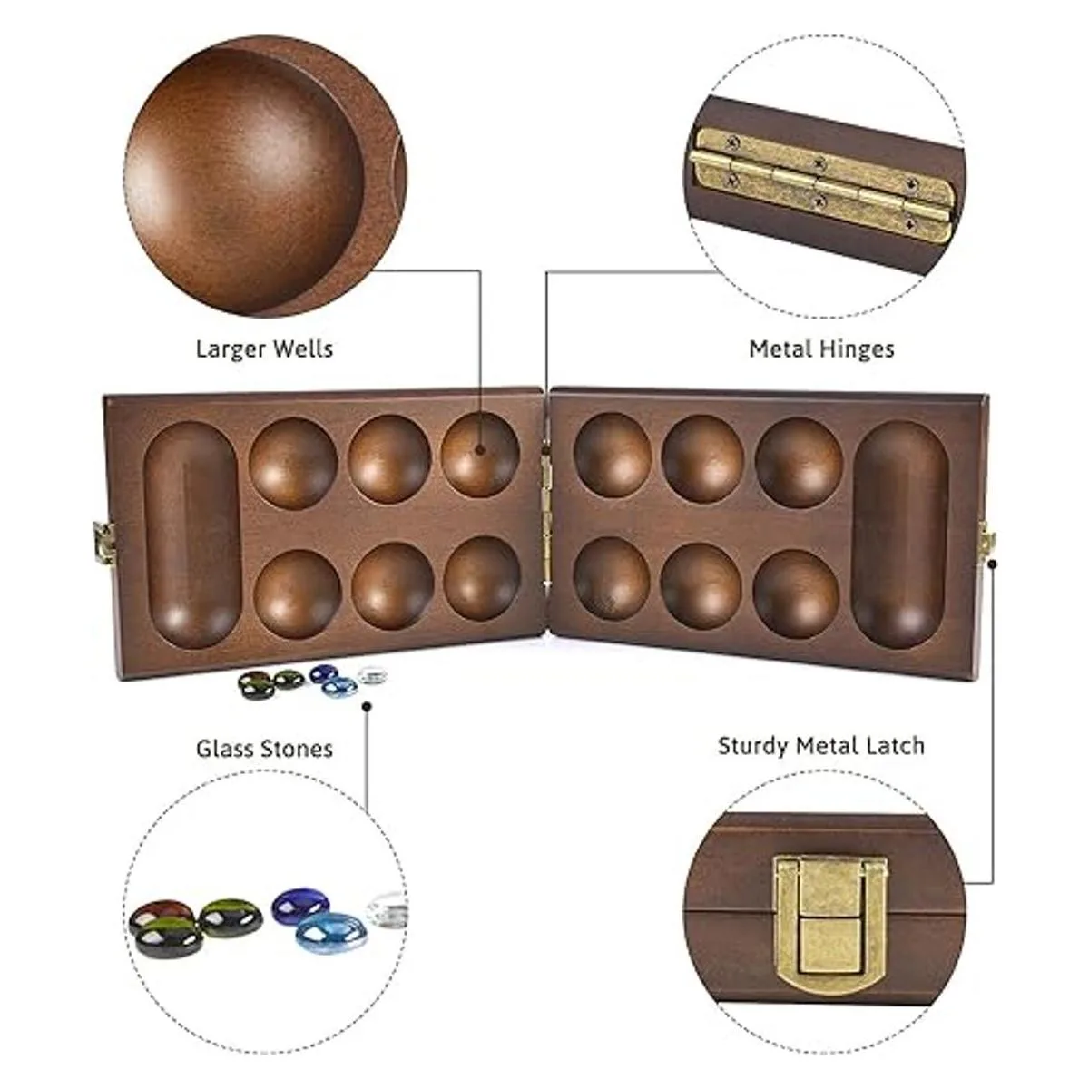 AMEROUS Juego de mesa Mancala de madera con 728 piedras de vidrio multicolor adicionales, tablero plegable, instrucciones de mancala, paquete de regalo, juego de mesa clásico familiar para edades de 6 a adultos, versión de mesa