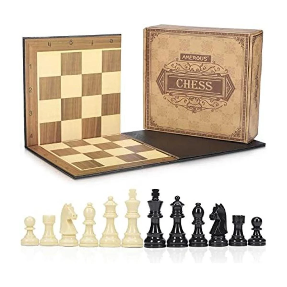 AMEROUS Piezas de ajedrez con peso mejorado con tamaño King de 3.0 pulgadas, tablero de ajedrez portátil de 15 pulgadas, 2 reinas adicionales, 2 bolsas de almacenamiento para ajedrez y juego de mesa de ajedrez para principiantes