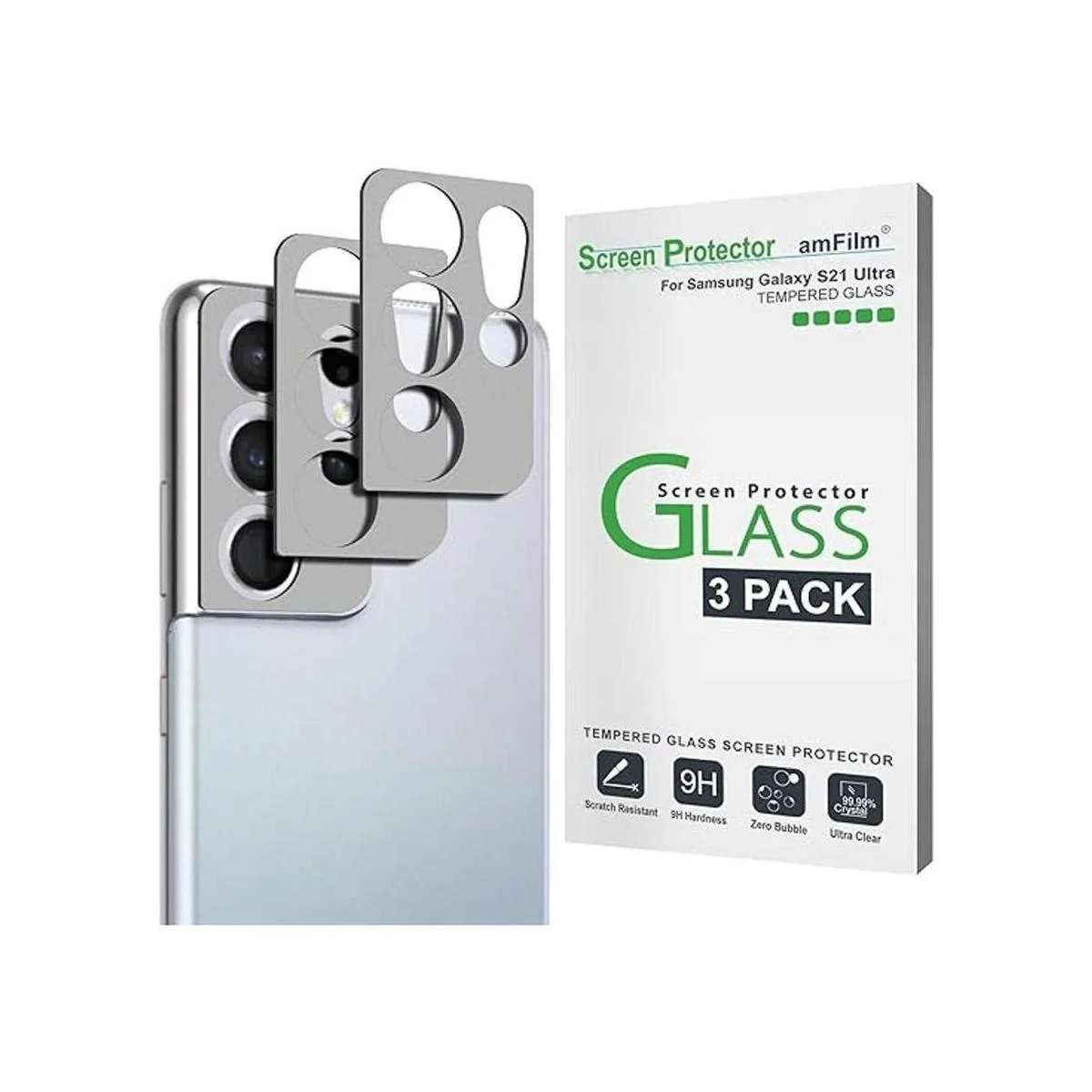 amFilm Protector de pantalla de cámara para Samsung Galaxy S21 Ultra 5G de 6.8 pulgadas, protector de lente de cámara de vidrio templado, sin reflejo de flash, color plateado
