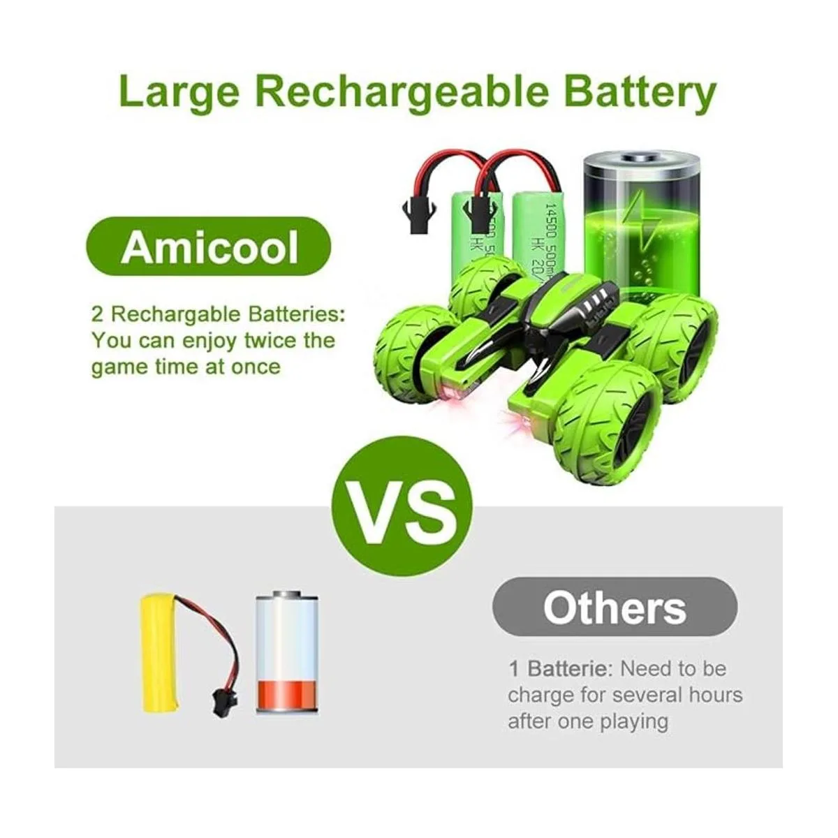 Hobby RC Car Antiinterferencias con faros LED Vehículo todoterreno RC con 2 luces LED y un transmisor de 2.4 GHz para un control suave y sin interferencias. El coche de juguete Amicool Stunt RC puede funcionar tanto de día como de noche. Las luces coloridas funcionales crean diversión sin fin para los niños. Este coche de control remoto para exteriores para niños o niñas es un gran compañero
