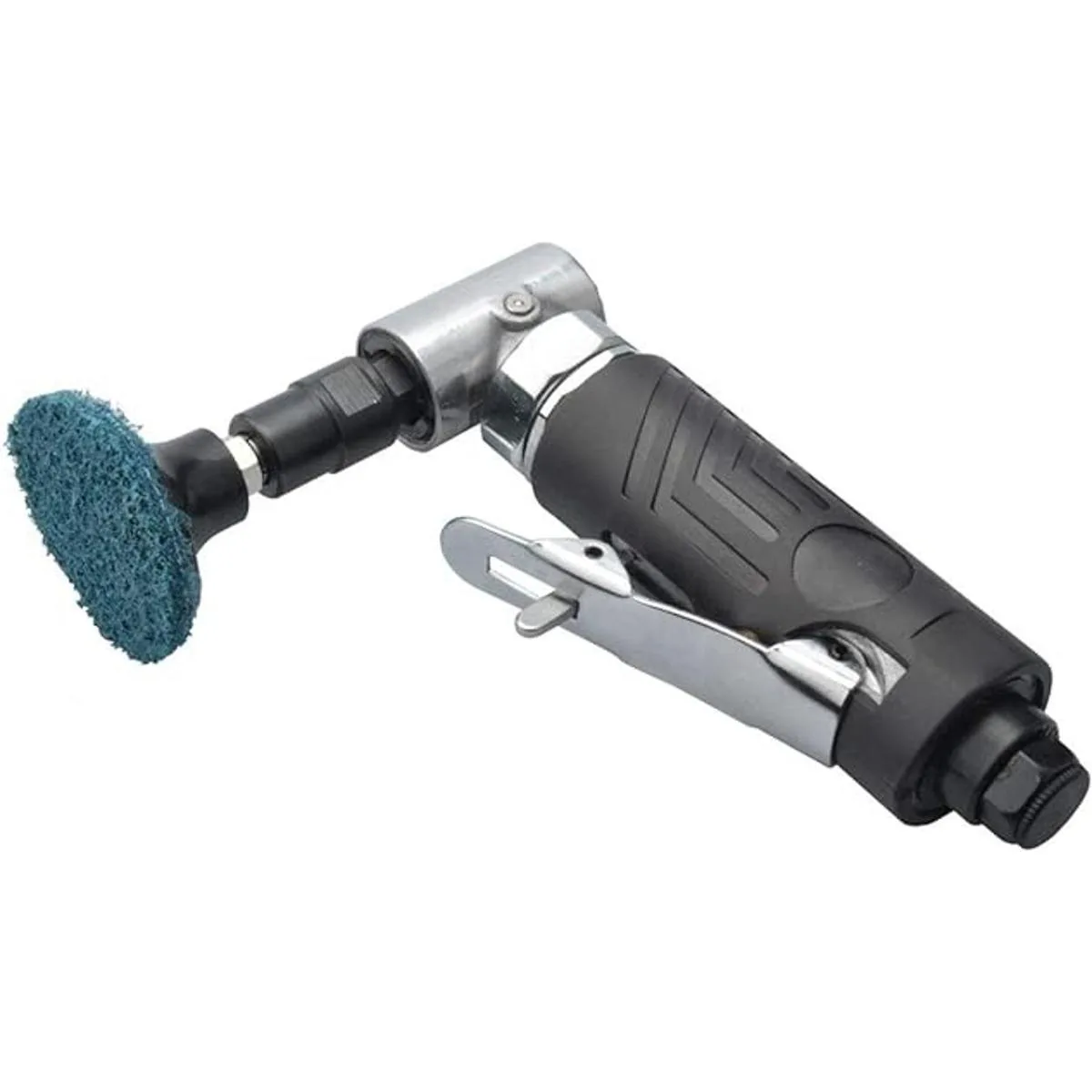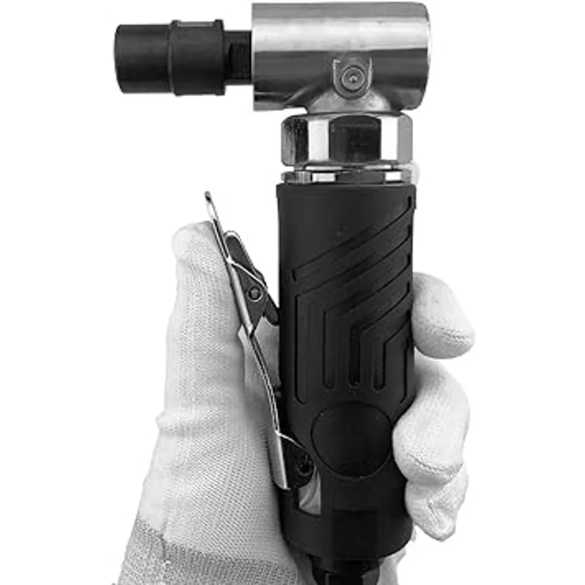 La amoladora angular está equipada con motor de 0.32 HP y puede funcionar con una velocidad máxima de 20.000 RPM. La amoladora angular neumática cuenta con un regulador de velocidad integrado para un mejor control.