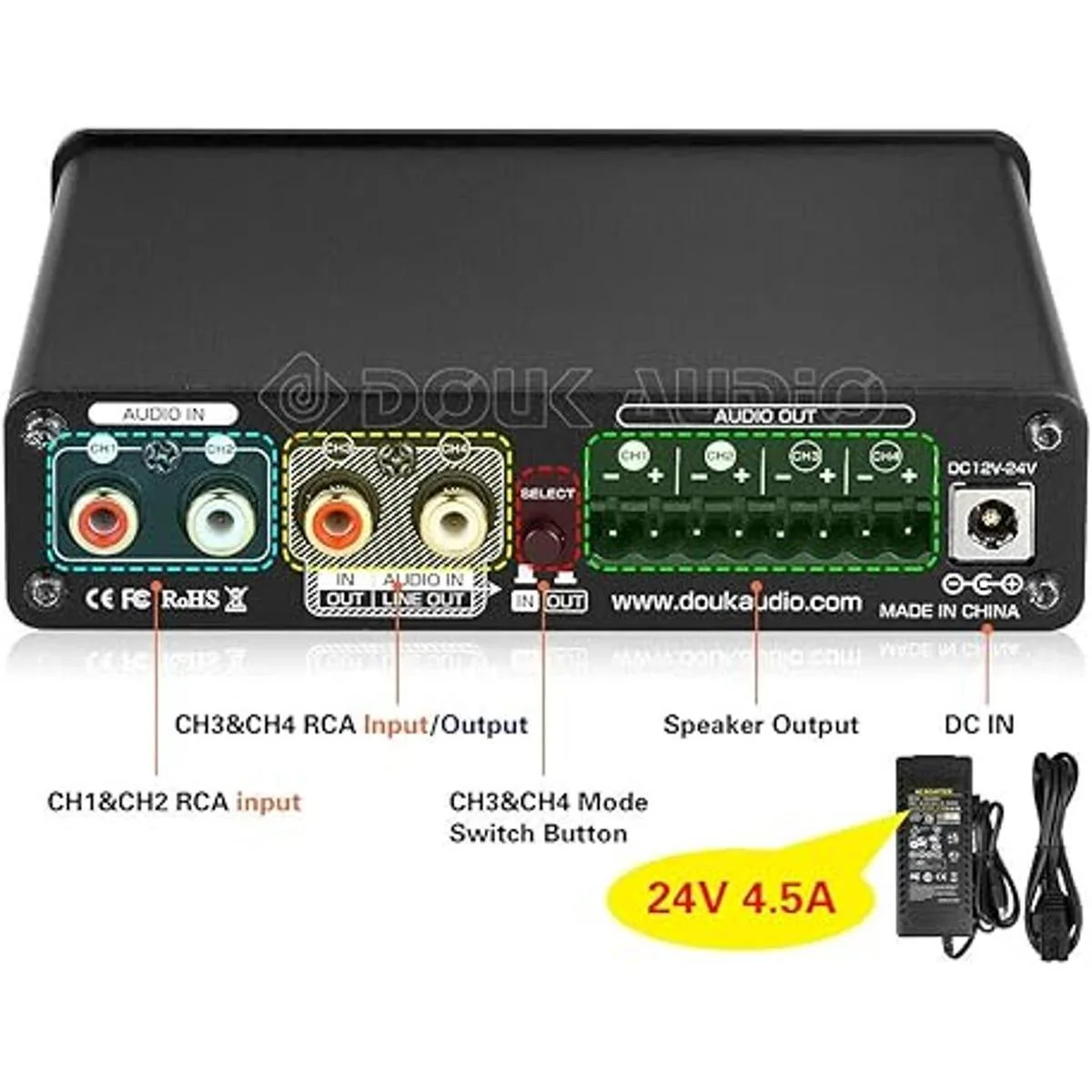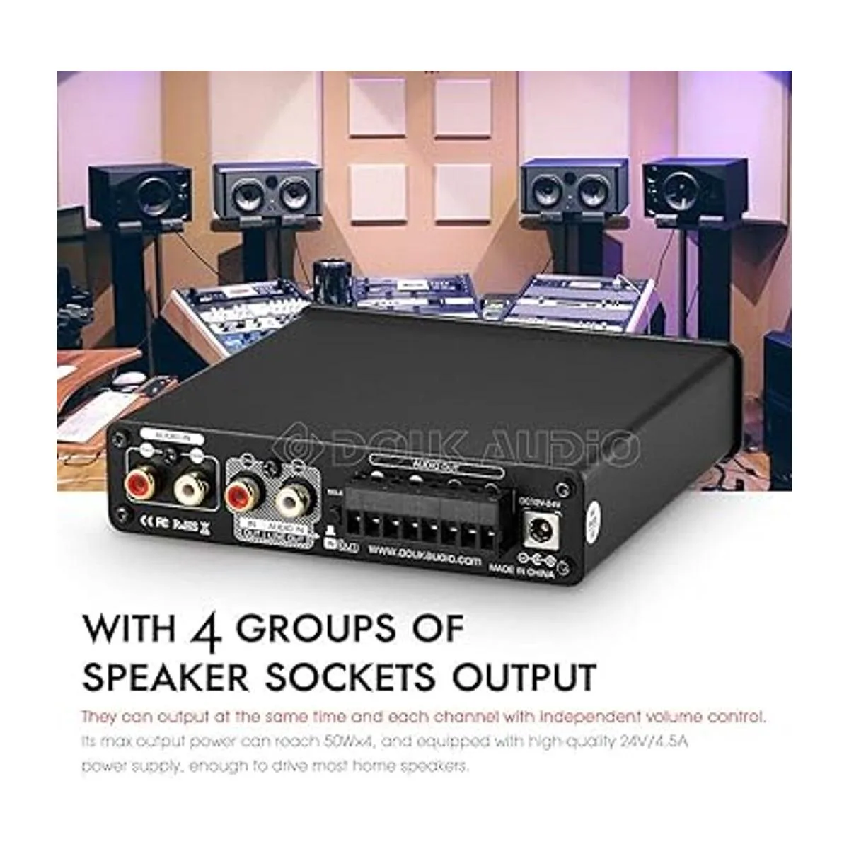 Con 4 grupos de salidas de altavoces, pueden emitir al mismo tiempo y cada canal con control de volumen independiente. Su potencia de salida máxima puede alcanzar 50 W 4, y está equipada con fuente de alimentación de alta calidad de 24 V/4,5 A, suficiente para conducir la mayoría de altavoces domésticos.
