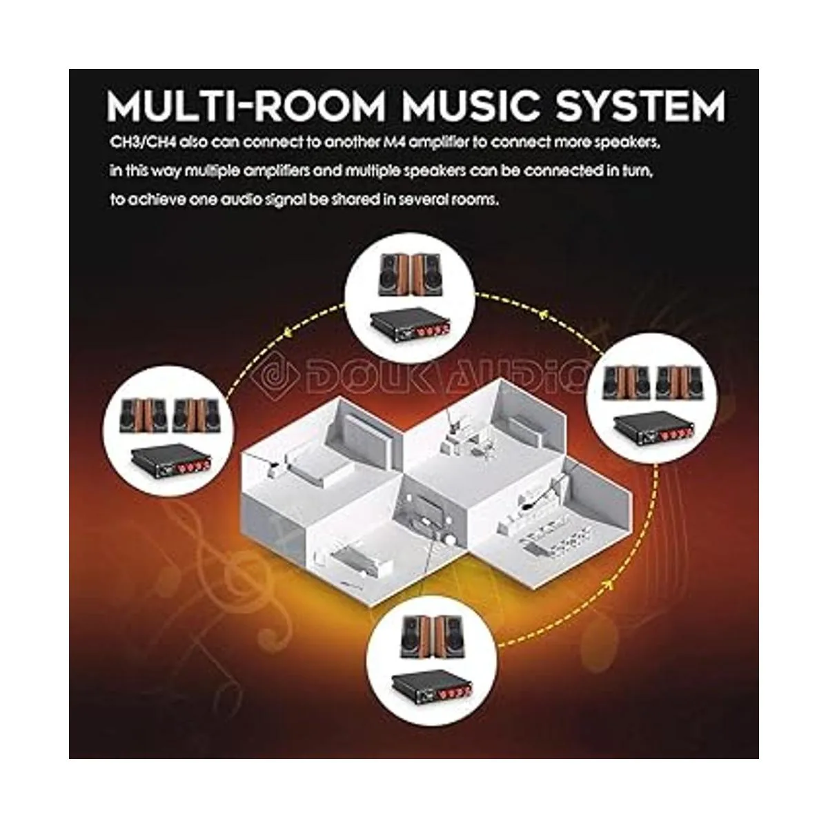 Amplificador Bluetooth de 4 canales, amplificador de potencia de audio de 50 W x 4, receptor de altavoz estéreo de alta fidelidad Douk Audio M4