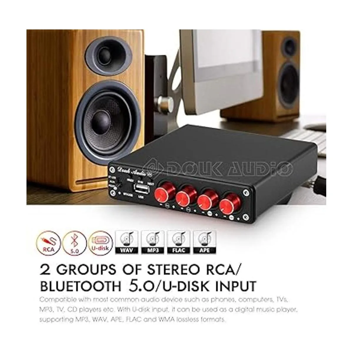 Compatible con 2 grupos de entrada RCA estéreo y Bluetooth 5.0 inalámbrica, compatible con la mayoría de dispositivos de audio comunes como teléfonos, computadoras, televisores, MP3, TV, reproductores de CD, etc. Con entrada de disco U, se puede utilizar como un reproductor de música digital, compatible con formatos MP3, WAV, APE, FLAC y WMA sin pérdidas.