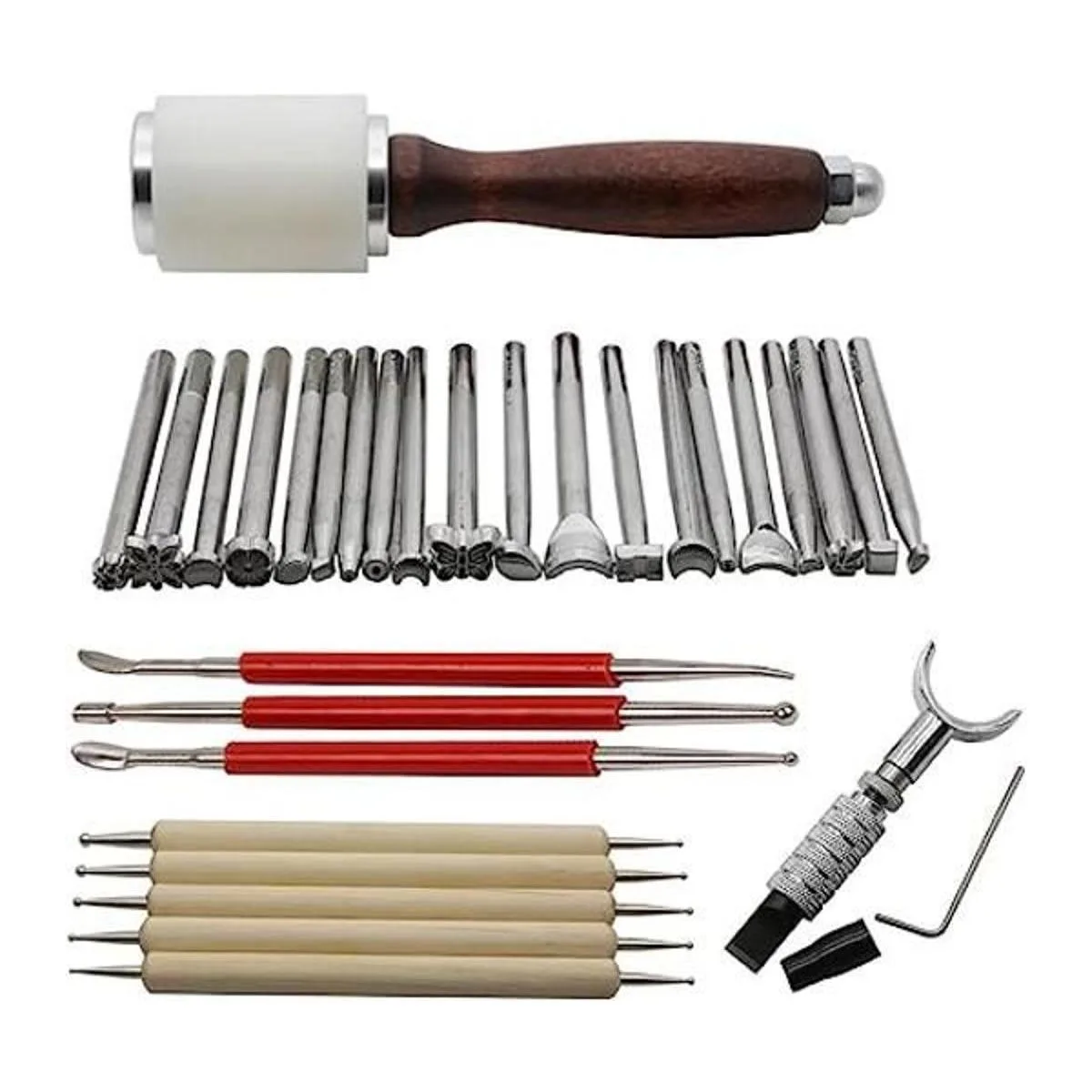 AMPSEVEN Juego de 20 herramientas para hacer sillín de trabajo de cuero, martillo giratorio, cuchillo de cuero, bolígrafo de modelado y herramienta de artesanía de cuero de doble punta