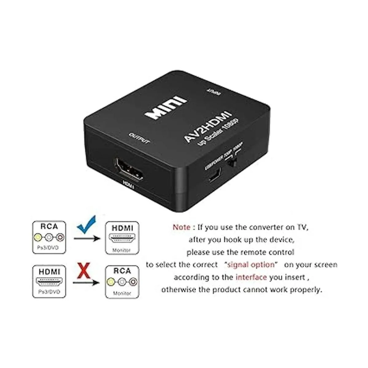 Plug and Play: la caja convertidor Mini RCA a HDMI no necesita controlador adicional, fácil de usar y fácil de operar. Conecta el cable de alimentación USB incluido a un adaptador de alimentación de 5 V 1 A cuando utilices este adaptador RCA a HDMI.