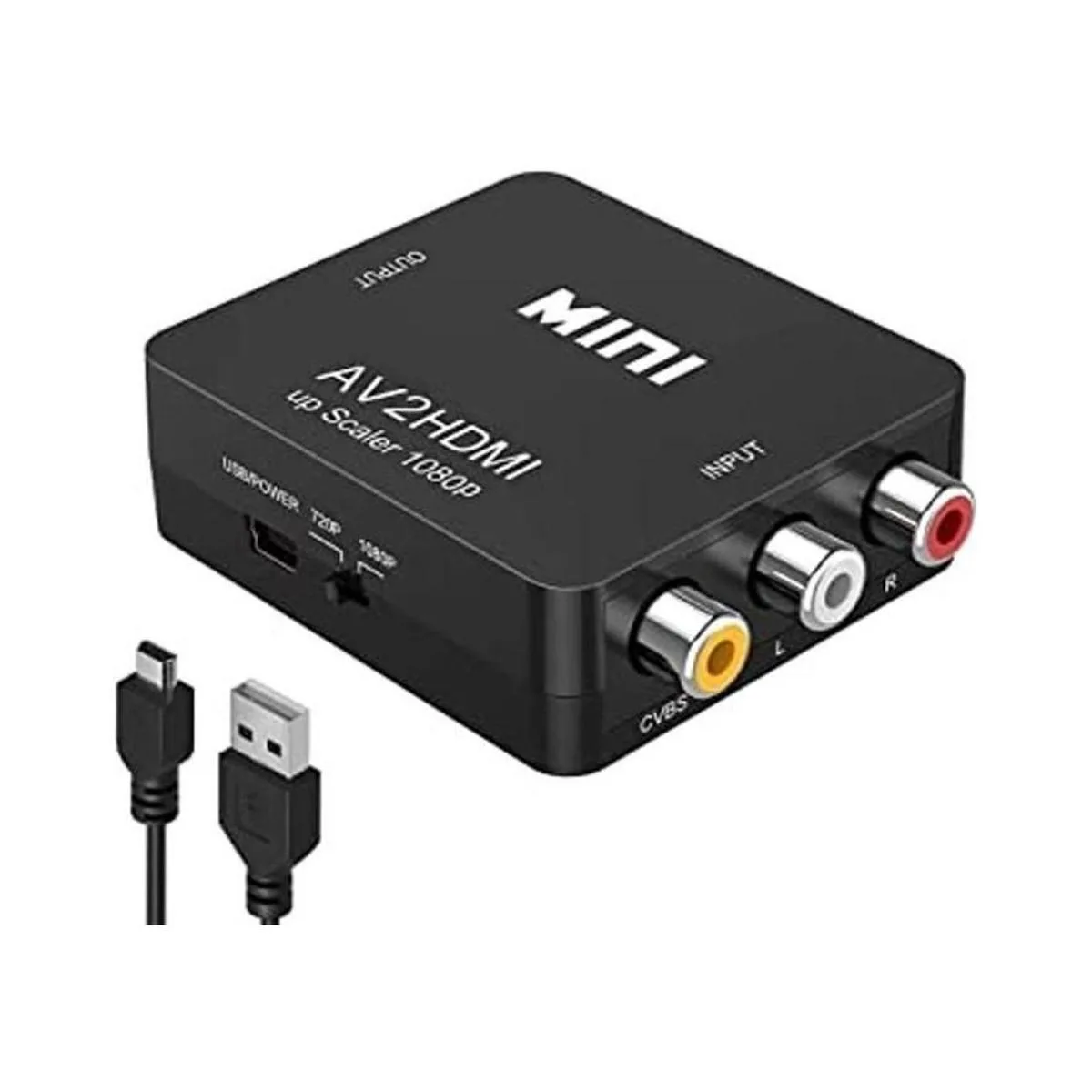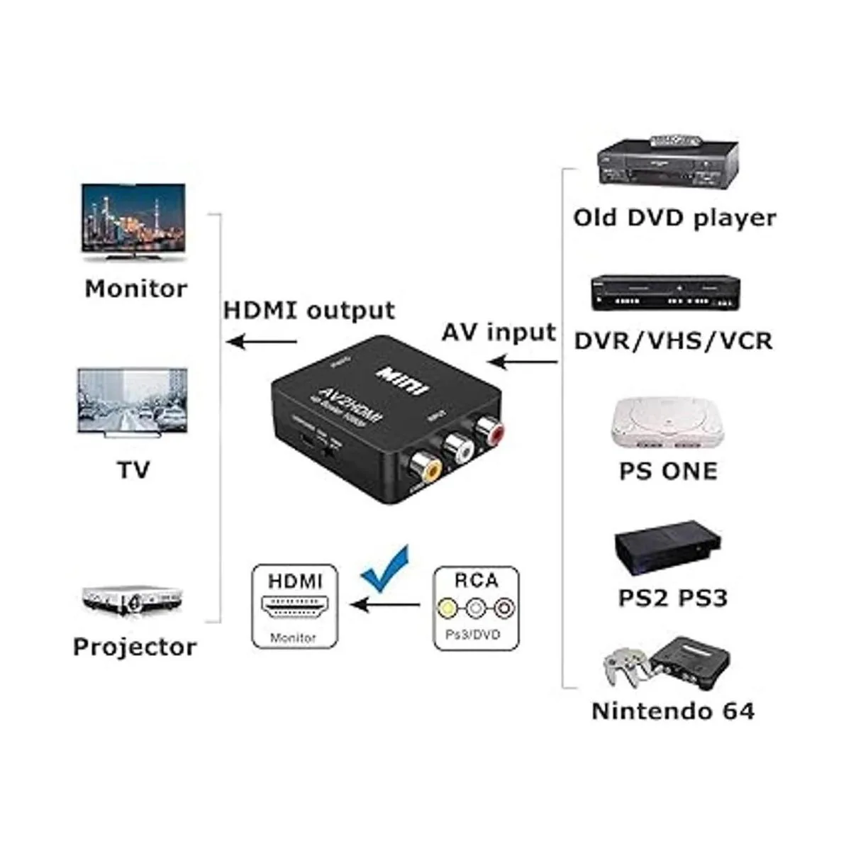 Convertidor AV a HDMI: convierte la entrada analógica RCA compuesta rojo, blanco, amarillo a salida HDMI 720P/1080P 60HZ. Puedes obtener todo tu viejo sistema de juego que emite con proyector RCA a HDMI