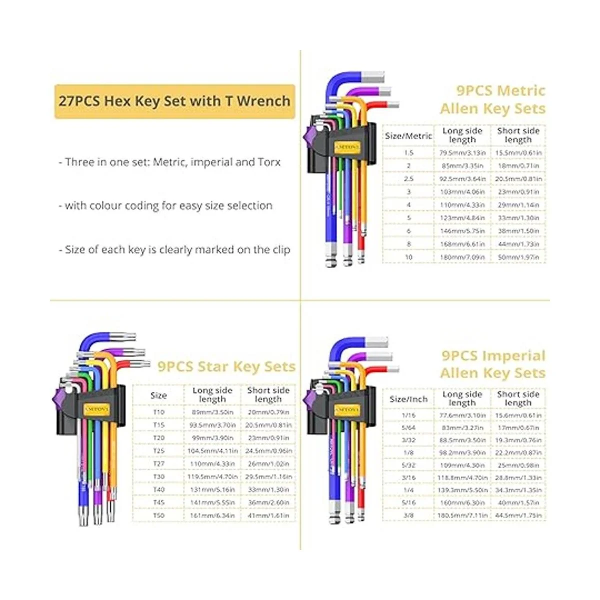 Herramienta de llave hexagonal de 27 piezas: métrico 9 piezas: 1.5, 2, 2.5, 3,4, 5, 6, 8, 0.394 in; pulgadas 9 piezas: 1/16 5/64 3/32 1/8 5/32 3/16 7/32 5/16 3/8; tamaño estrella 9 PC s: T10 , T15, T20, T25, T27, T30, T40, T45, T50; viene con una bolsa de almacenamiento, bueno para mantener todas las piezas del juego juntas