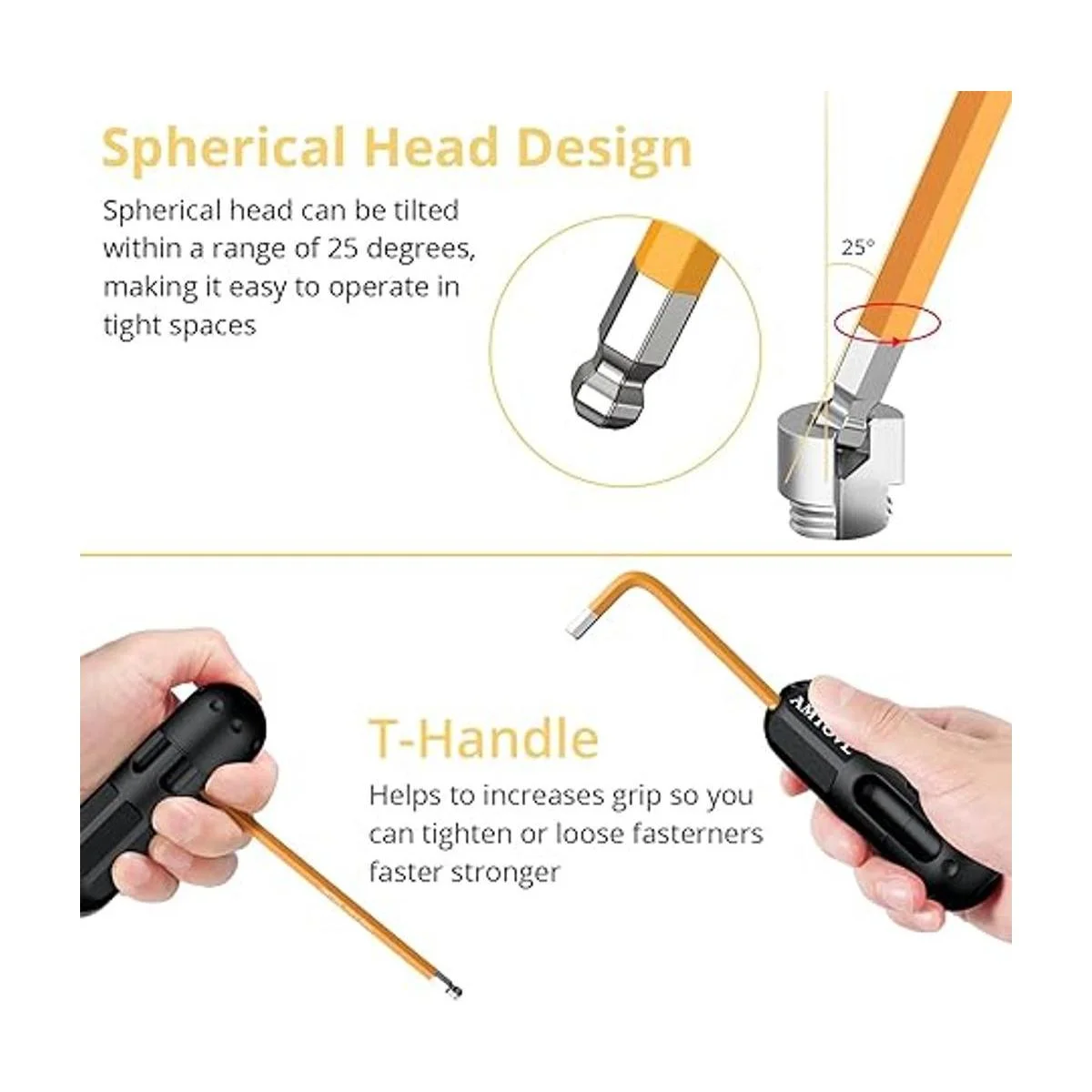 Diseño de cabeza esférica de bola: permite girar sujetadores difíciles de alcanzar hasta 25 grados, acabado de óxido negro para protección contra la corrosión, chorro de arena para una superficie lisa