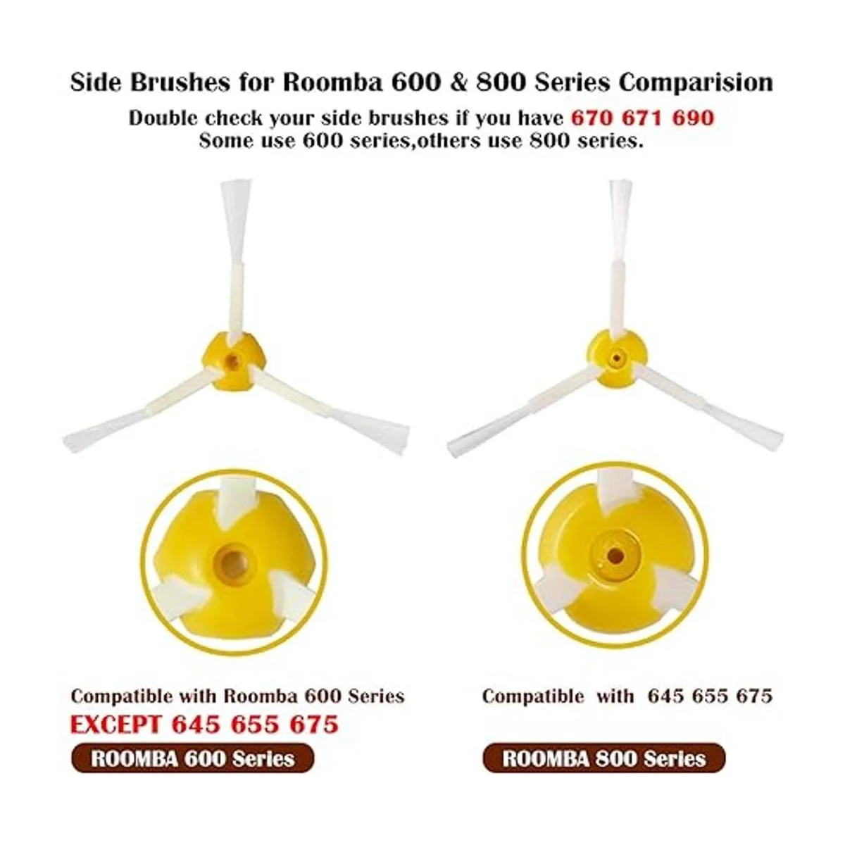 El kit de piezas de repuesto es compatible con aspiradora iRobot Roomba 600 Series 585 595 614 618 620 630 650 660 680 685 690 692 694 695 no para aspiradora 645 655 675. hay dos configuraciones de Cepillos laterales/de barrido para modelos 670 671 675 690. Compara tu corriente con uno con la imagen n. 2. antes de realizar el pedido.