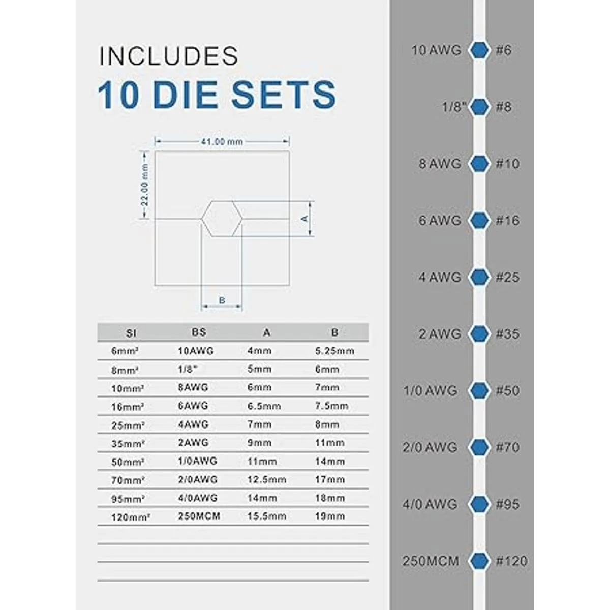 Especificaciones de los troqueles: Viene con troqueles de crimpado para 10 AWG, 8 AWG, 6 AWG, 4 AWG, 2 AWG, 1/0 AWG, 2/0 AWG, 4/0 AWG, 250 MCM y 1/8 pulgadas para cuerda de alambre de acero inoxidable