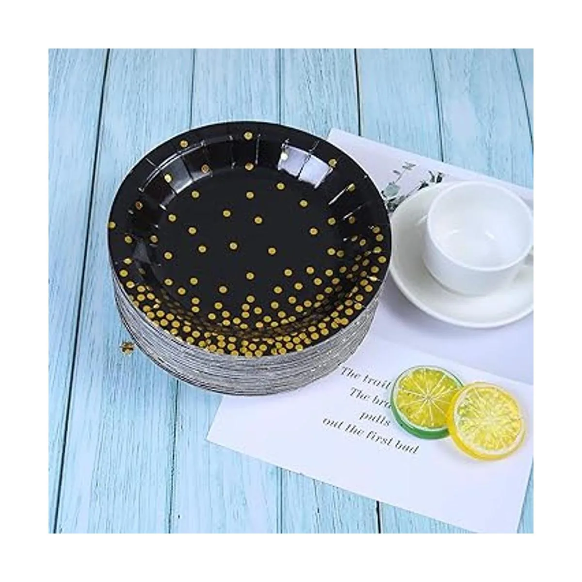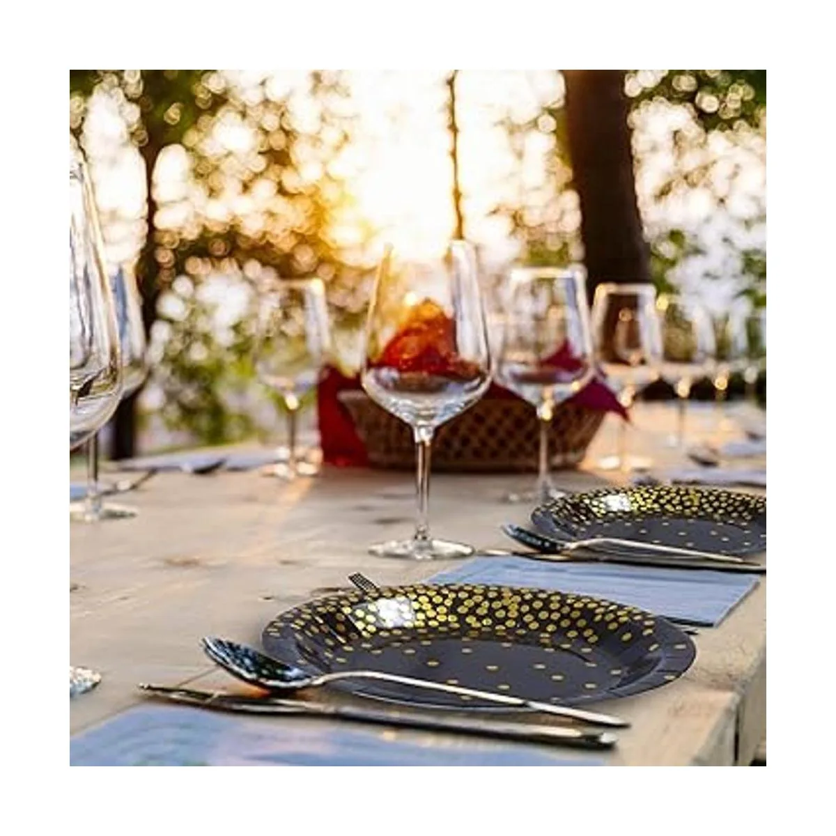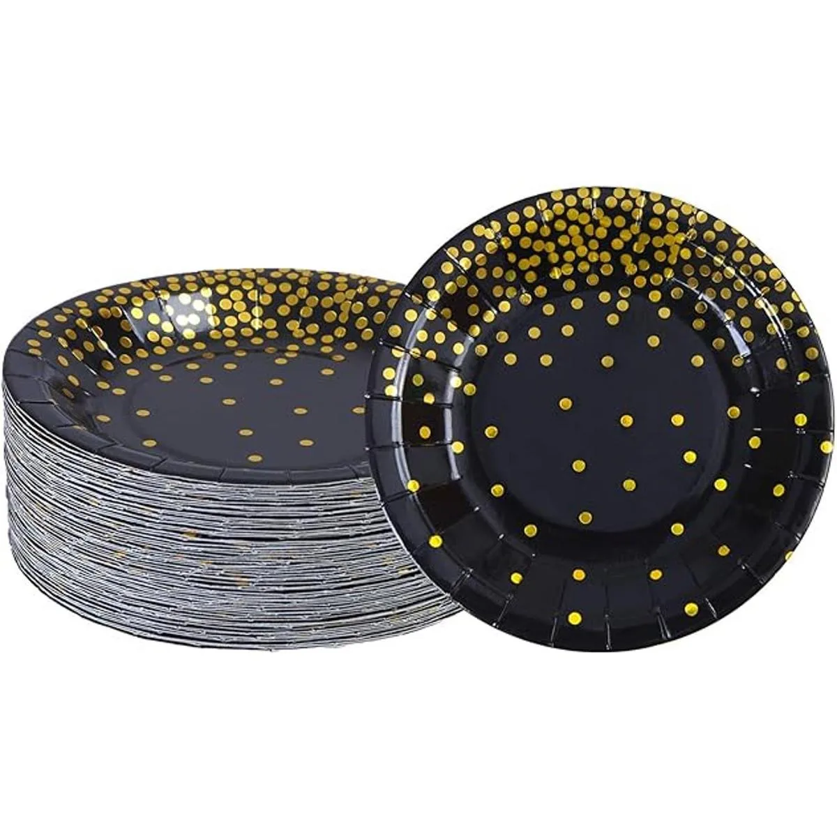 Cantidad: 60 platos de papel en un paquete, cada uno es negro con puntos dorados bronceados, clásico y elegante, adecuado para uso diario y uso en fiestas