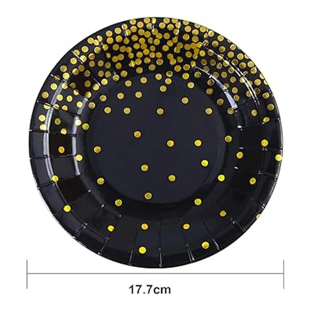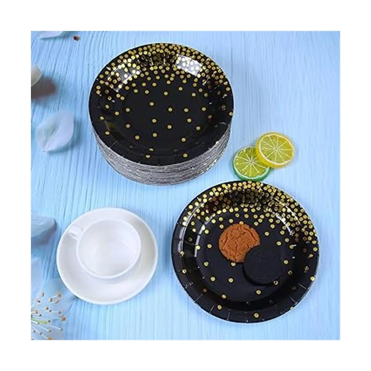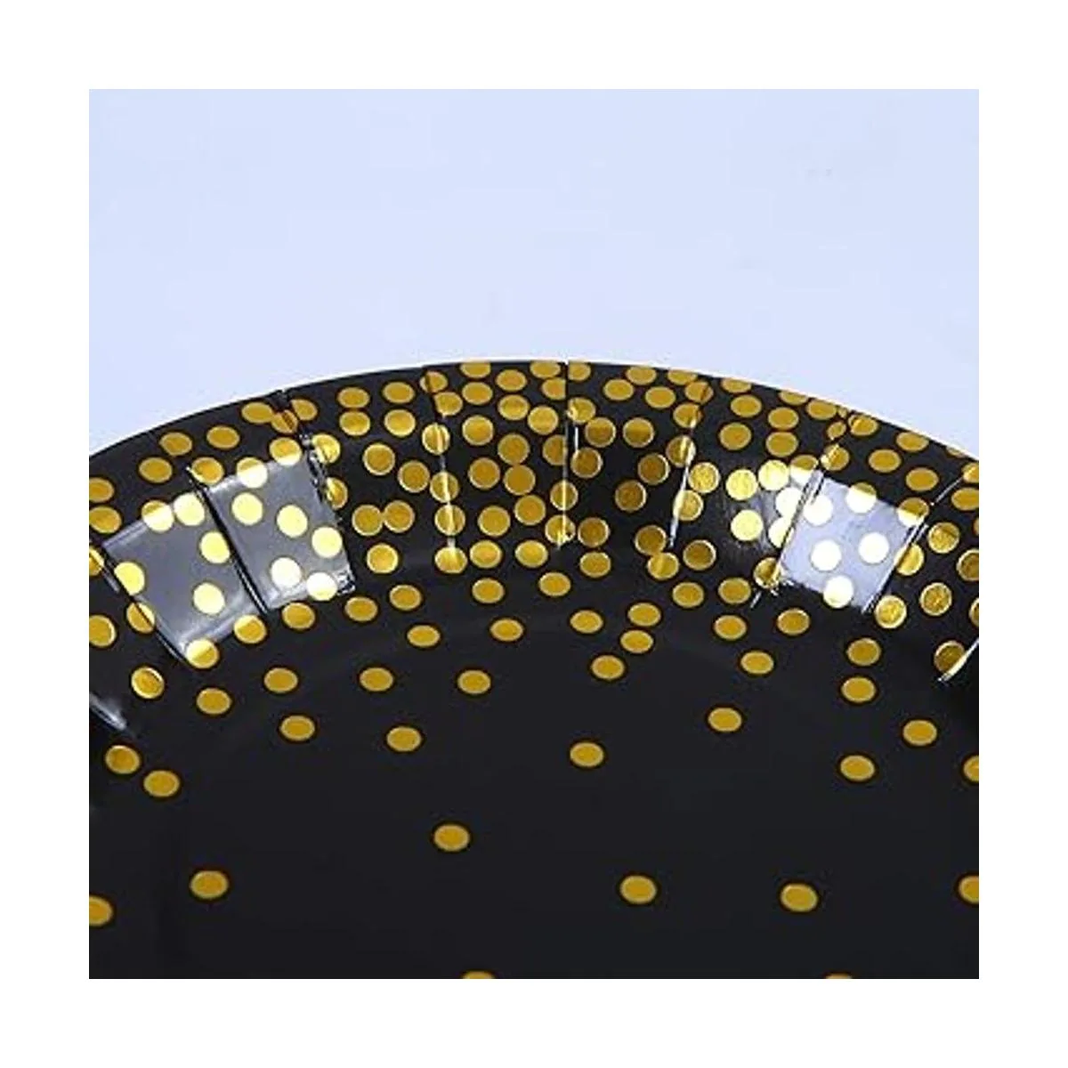 Cantidad: 60 platos de papel en un paquete, cada uno es negro con puntos dorados bronceados, clásico y elegante, adecuado para uso diario y uso en fiestas